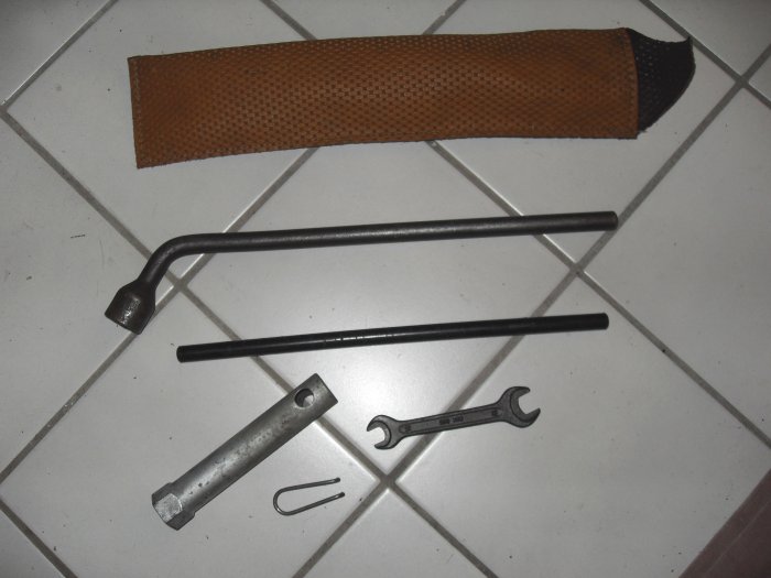 Ich kenne nur den Wagenheber, Radkappenabziehklammer, die Betätigungstange und den Steckschlüssel. Den Schraubenschlüssel Schraubendreher und Schraubenzieher kenne ich nicht, genausowenig die Textiltaschen.