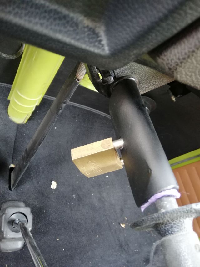 Ich habe aus 5 mm Blech ein U gebogen und lege es auf die Verzahnung der Handbremse. Der Stift welcher den Griff fixiert wurde durch eine Madenschraube mit Innensechskant ersetzt. Zusätzlich kommt noch eine "stramme" Kette vom Lenkrad bis an das Vorhängeschloss.