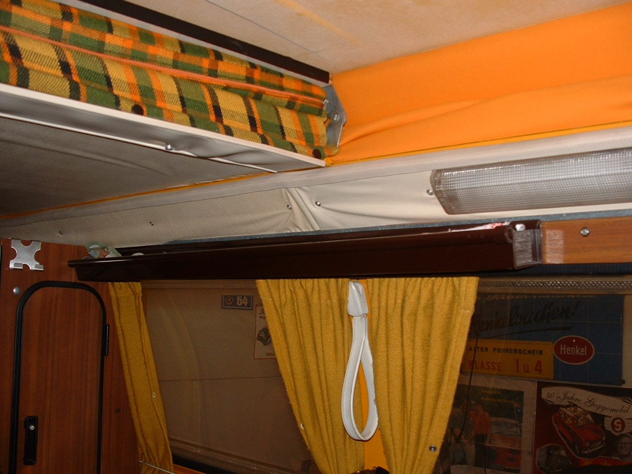 Diese kleinen Dachrinnen aus dem Baumarkt, die eigentlich für Gerätehäuser und Gartenlauben gedacht sind, eignen sich ideal für diesen Zweck und werden wohl auch von anderen Firmen hergestellt. Wir hatten uns für "Marley "entschieden, weil der braune Farbton so gut in den Bulli passt, als ob die Dinger ab Werk dort eingebaut worden wären. Das Beste daran: Man muss kein zusätzliches Loch bohren und kann die originalen Schrauben benutzen, die dort vorhanden sind, um die Blende über den Gardinen zu halten.