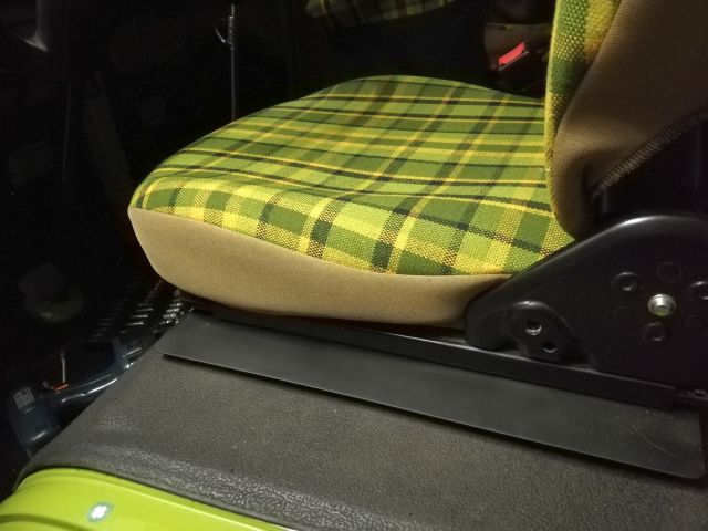 Ja, ist bekannt. Da die Sitze minimal breiter sind, müssen sie ca. 1 cm weiter zur Fahrzeugmitte montiert werden. Nur so stoßen sie nicht gegen die Box mit dem aufgerollten Sicherheitsgurt. Mag bei anderen ggf. nicht so sein. Die Bezüge werden in der Sitzmitte aus Originalstoff grün kariert und außen aus schwarzem Stoff gefertigt. Blöd ist, daß der Beifahrersitz nur geklappt drehbar ist, er stößt sonst beim drehen gegen das Dach. Dir ist das egal, daher kannst Du zwei Fahrersitze verbauen.