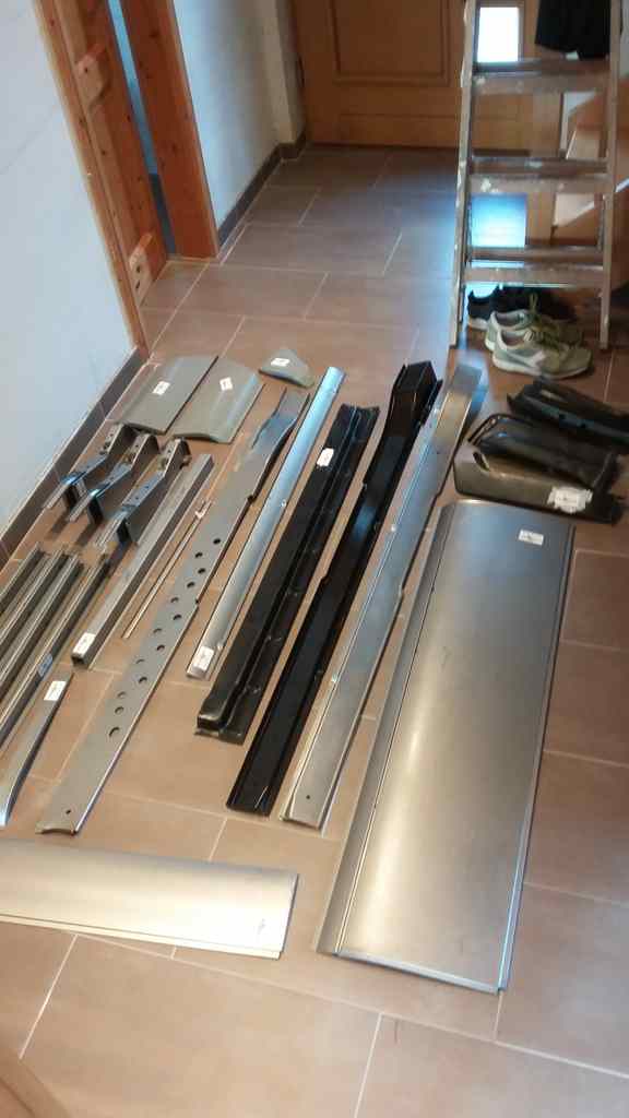 Bus ist zerlegt, Schweller, Wagenheberaufnahmen, Außenenden der Doppel-t-träger, U-Träger vorne außen, Gurtbefestigungen in den Radhäusern, Teile der vorderen Einstiege, kleine Stelle an der hinteren linken Ecke, Teile des Bodens vorne und der Teil des Bodenblechs wo der linke Innenschweller festgeschweißt ist sind bereits herausgetrennt.