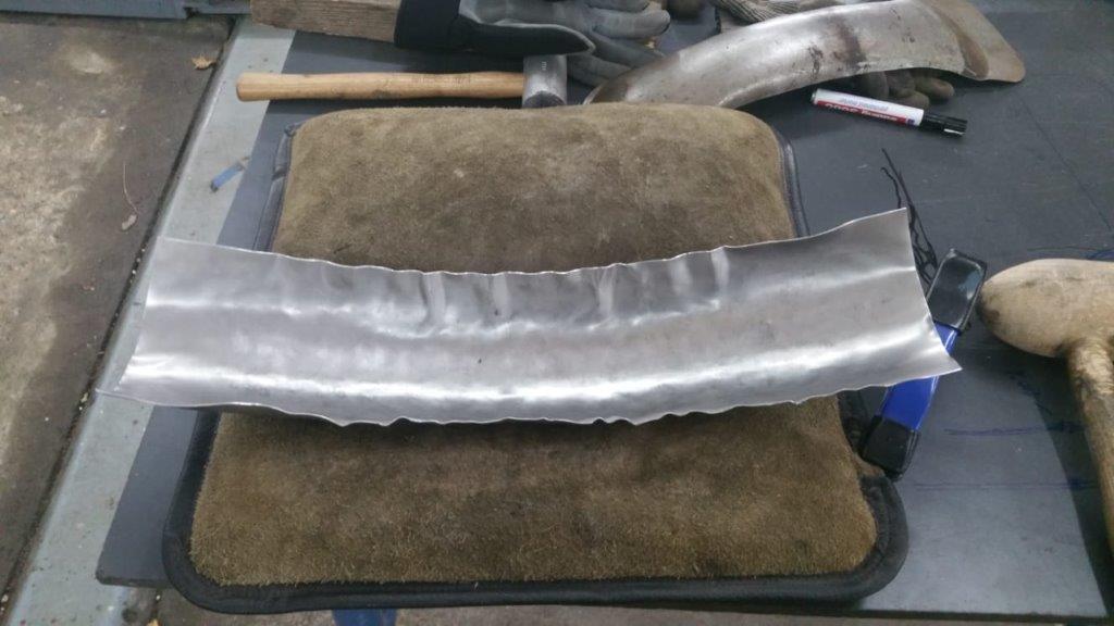 Beim ersten Versuch war mir das Blech im Streckbereich eingerissen. Was mit einem anderen Hammer und einer anderen Schlagtechnik schnell erledigt war.