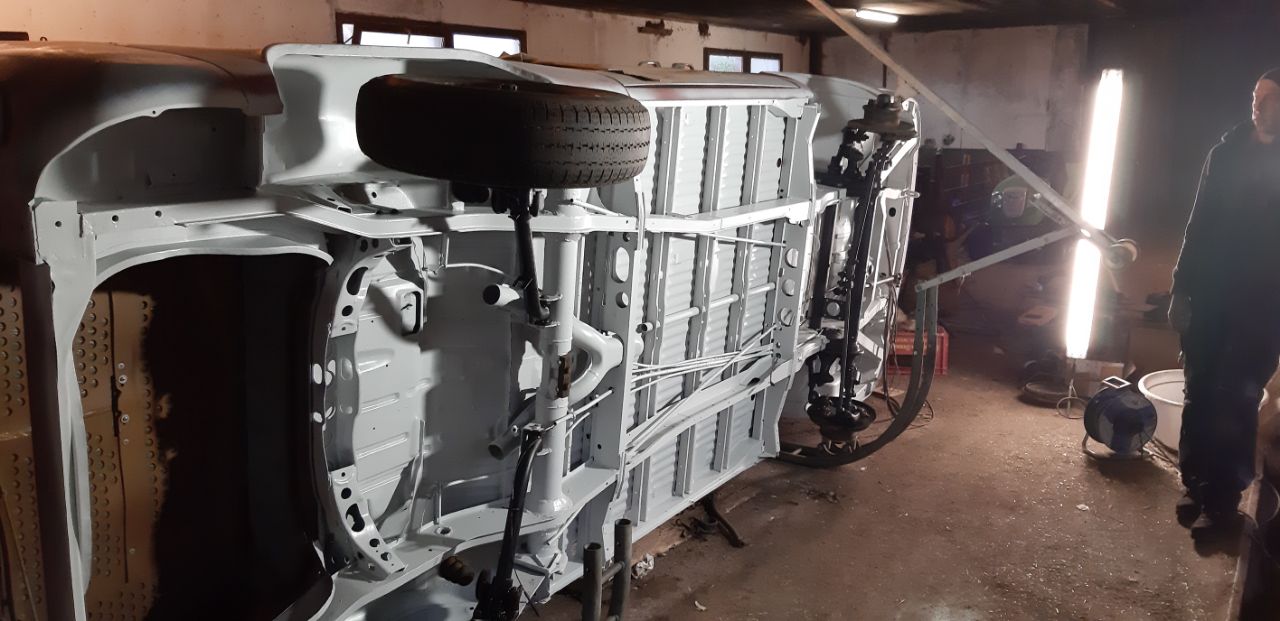 am Samstag habe ich die Vorder- und Hinterachse montiert und den Bus nach etwa 6 Monaten wieder auf die eigenen vier Räder gestellt.