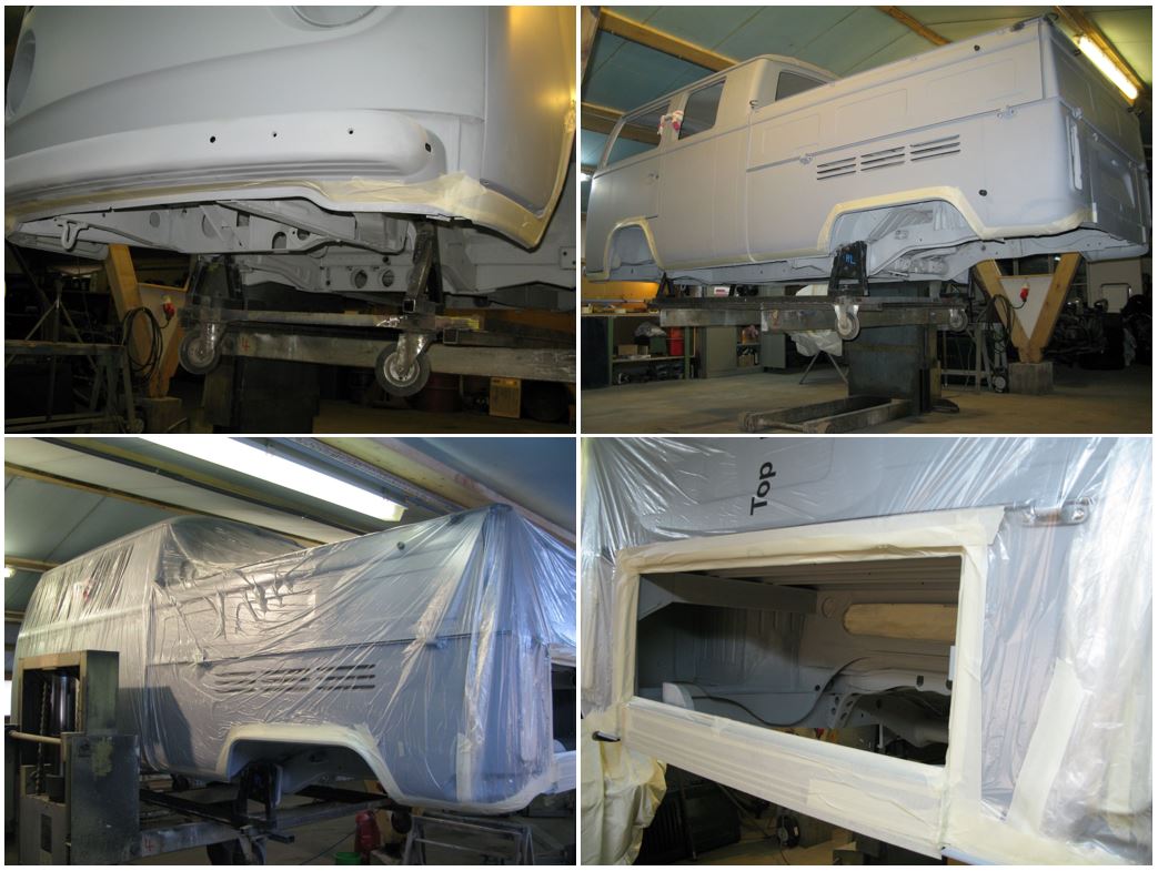 Danach kam "nass in nass" Autolack drauf. Habe mich für die Originalfarbe L345, Lichtgrau entschieden. So war die Doka ursprünglich mal und so soll sie wieder werden.