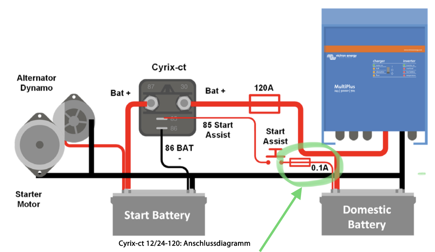 Hab mir für das Cyrix-CT (120A) etwas mehr Informationen eingeholt und auf der Hompage des Herstellers u.a. diesen Anschlussplan gefunden: Hab ihr auch die Sicherungen 120A und 0,1A verbaut?