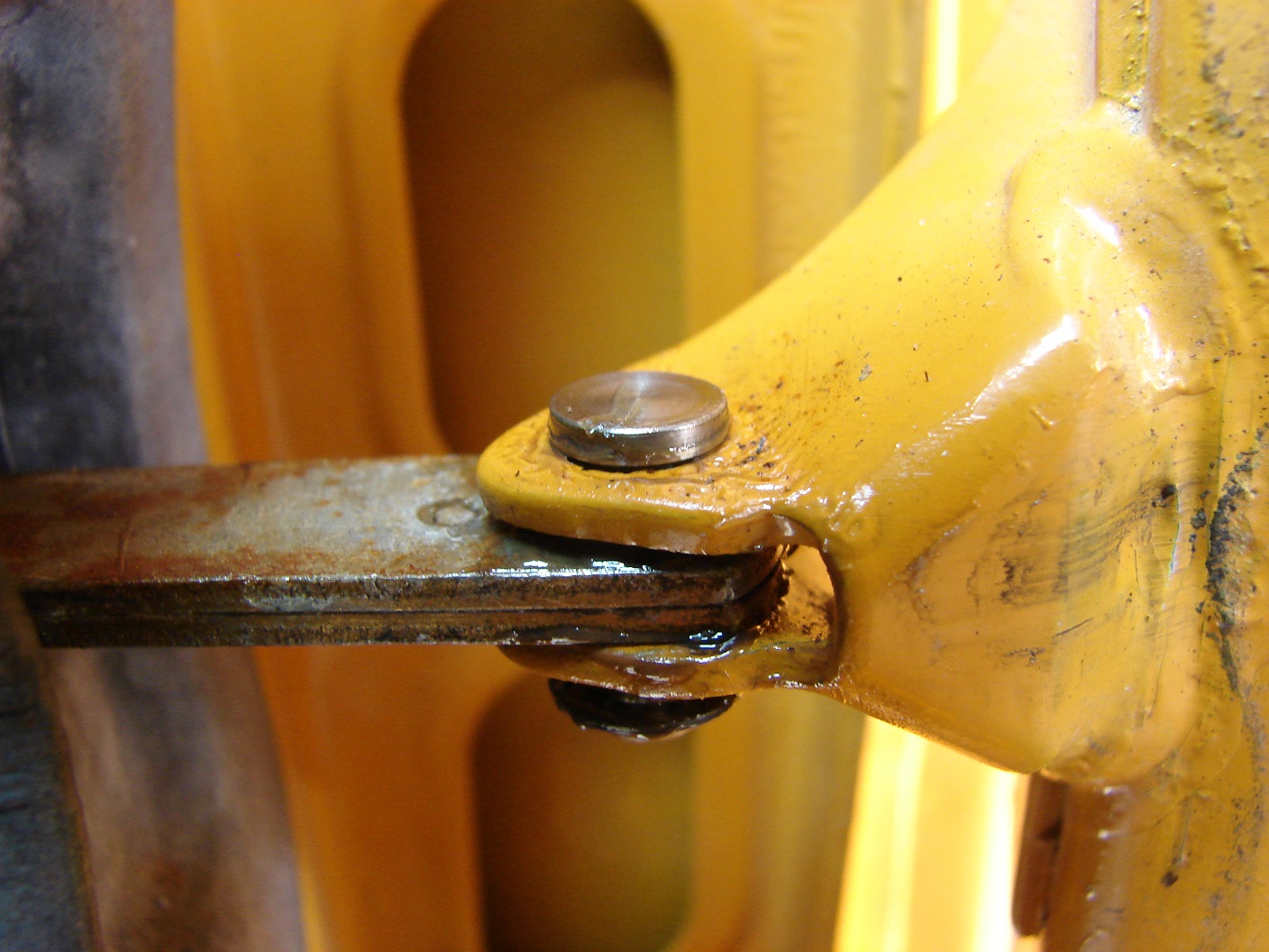 ich habe ein 78er Baujahr und meine Befestigung sieht deshalb ein wenig anders aus als Norberts. Der Bolzen war bei mir um etwa 1 mm im Durchmesser abgeschliffen und die Bohrung in der Karosserie etwa 1 mm oval (nach 35 Jahren wohl normal).