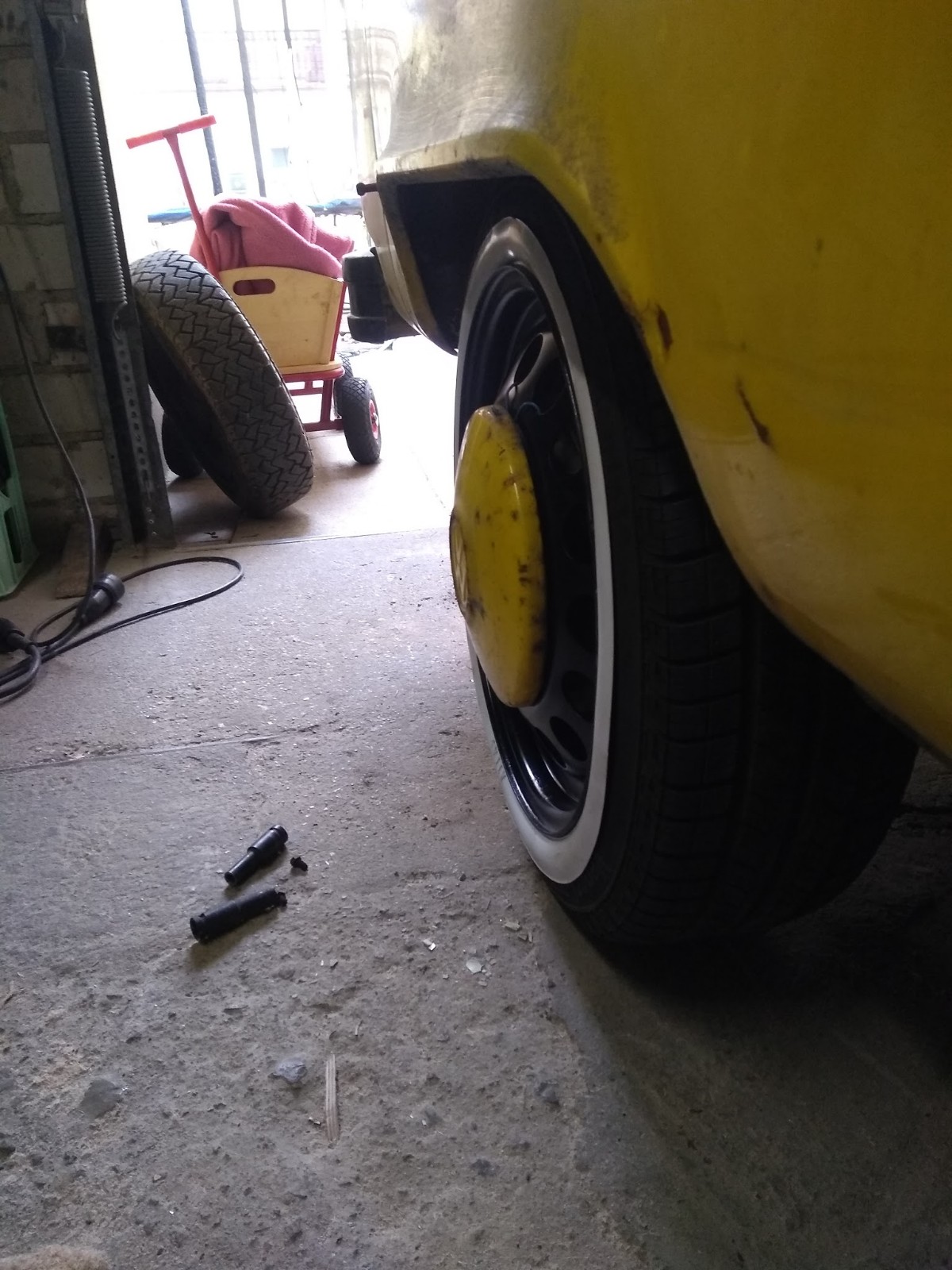 Hier habe ich testweise mal eine schwarz lackiert und einen 17 zoll Weißwandring mit draufgezogen