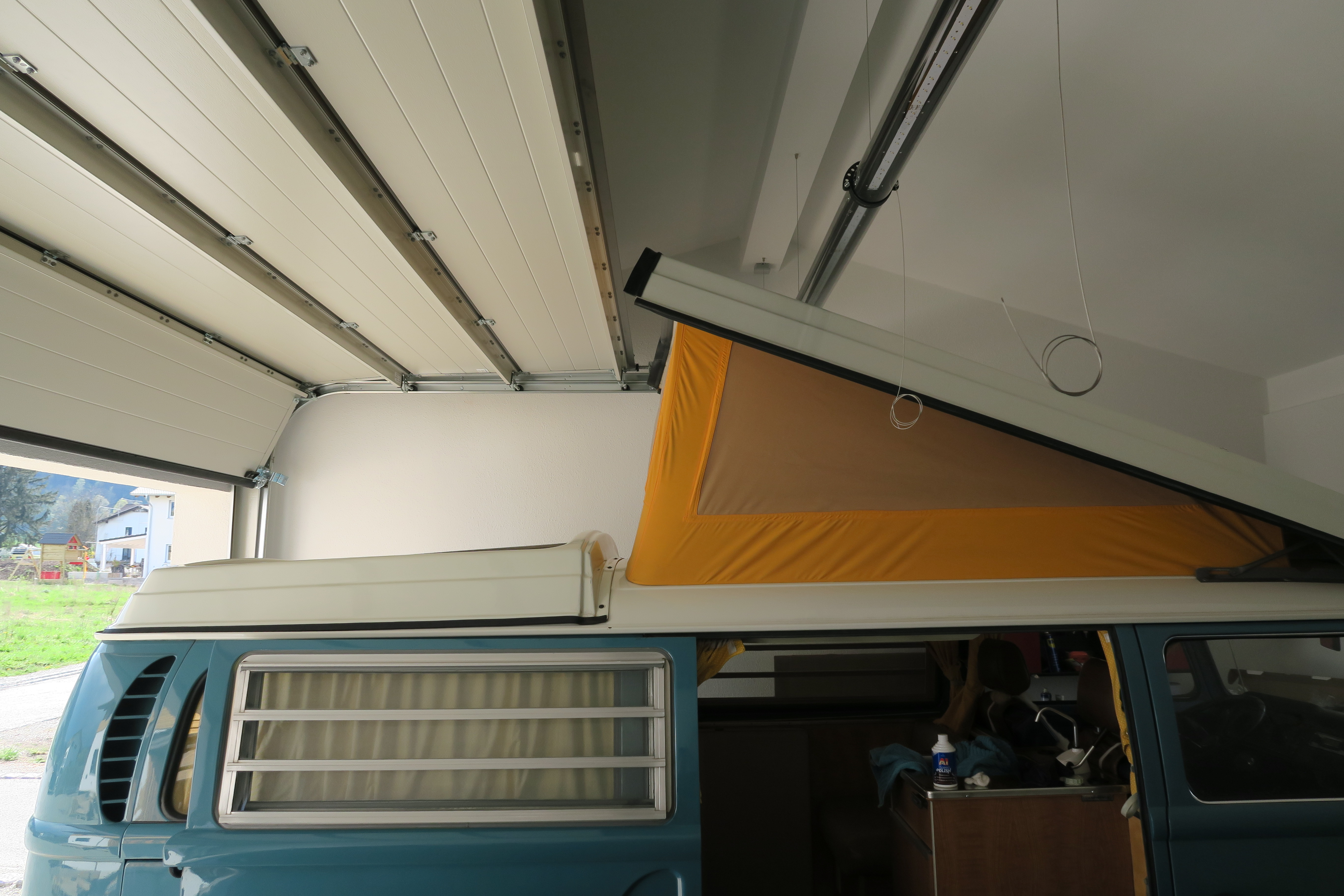Der Start war top, denn der Plan ging auf. Der Bulli passt mit geöffnetem Hubdach in die neue Garage.