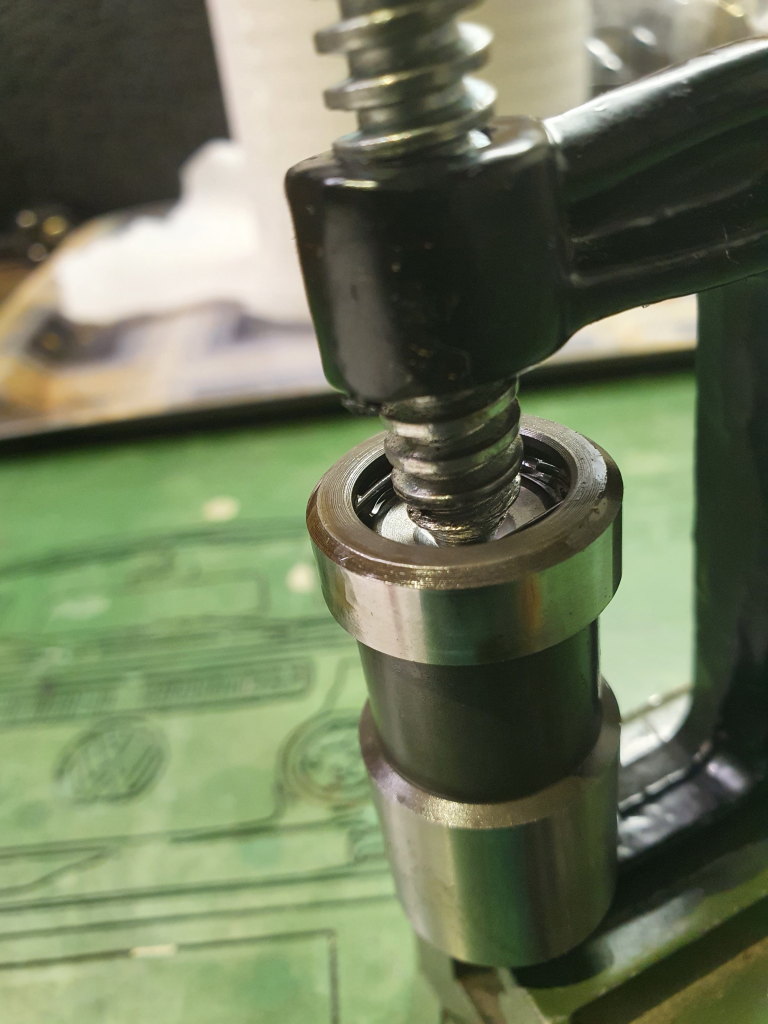10 Stößelpfanne einsetzen und mit der Schraubzwinge langsam und mit etwas Geduld den Stößel zusammen drücken Wenn das zu leicht geht, ist entweder noch Luft im Stößel, oder der Hydro ist verschlissen.