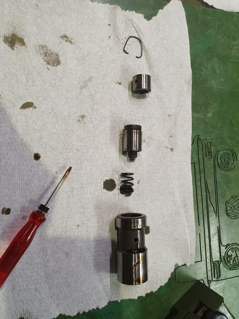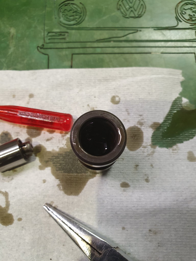 b) Der Stößel war nicht unter Druck, sondern das Öl ist von alleine durch die liegende Position aus dem Hydrostößel ausgetreten und es befindet sich nun Luft im Arbeitsraum.