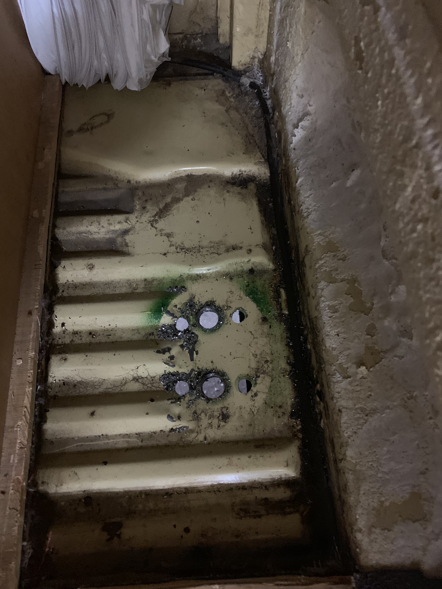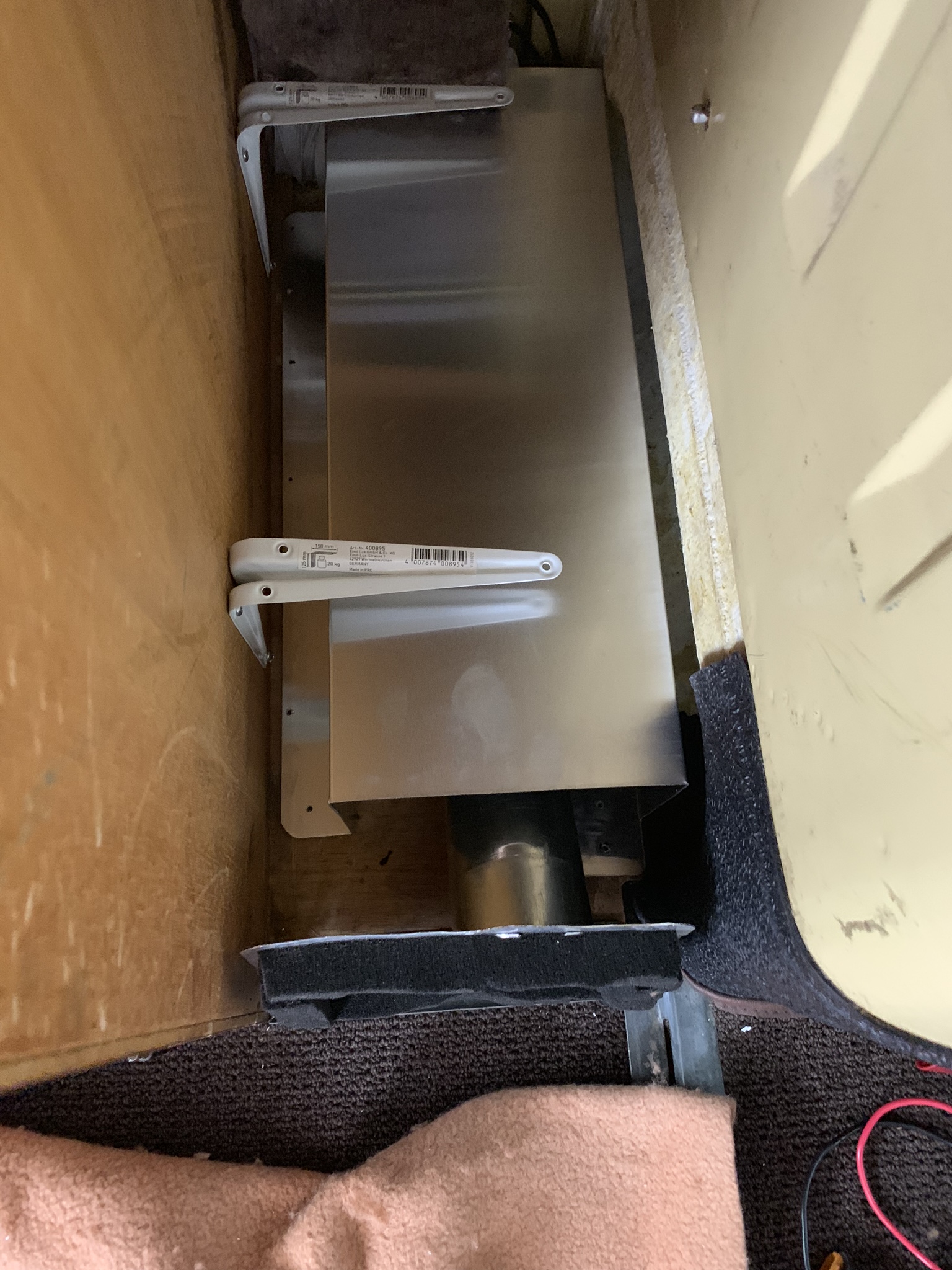Als Heizung habe ich eine Webasto AirTop 2000 in das Reserveradfach integriert. Diese Stelle bietet sich an, da zu und Ableitungen unter dem Fahrzeug durch den Querträger geschützt sind. Gleichzeitig das vorhandene Bodenblech sehr eben. So muss man nur 5 Löcher bohren. Zunächst wurde die Holzplatte der Küchenzeile ausgeschnitten und der Belüftungsschlauch hinter die Küche gelegt. Die Standheizung zieht also die Luft unter der Kühltruhe weg und bläst sie beim Reserveradfach wieder aus. Dann wurden die Bohrungen für die Heizung gesetzt.