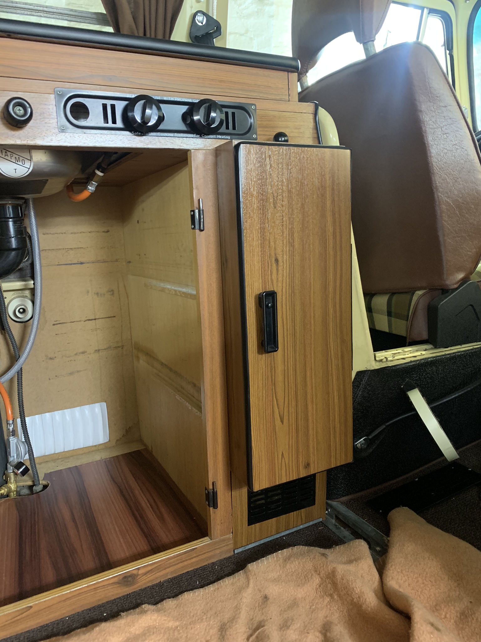 Türen wurden mit Original Furnier und Keder versehen. Zum thermischen Schutz und zum gerichteten Auslass der Heißluft wurde eine Hitzeschutzblech aus Alu gefertigt. Steuerelement habe ich in das Panel bei der Kühltruhen Entlüftung gesetzt.