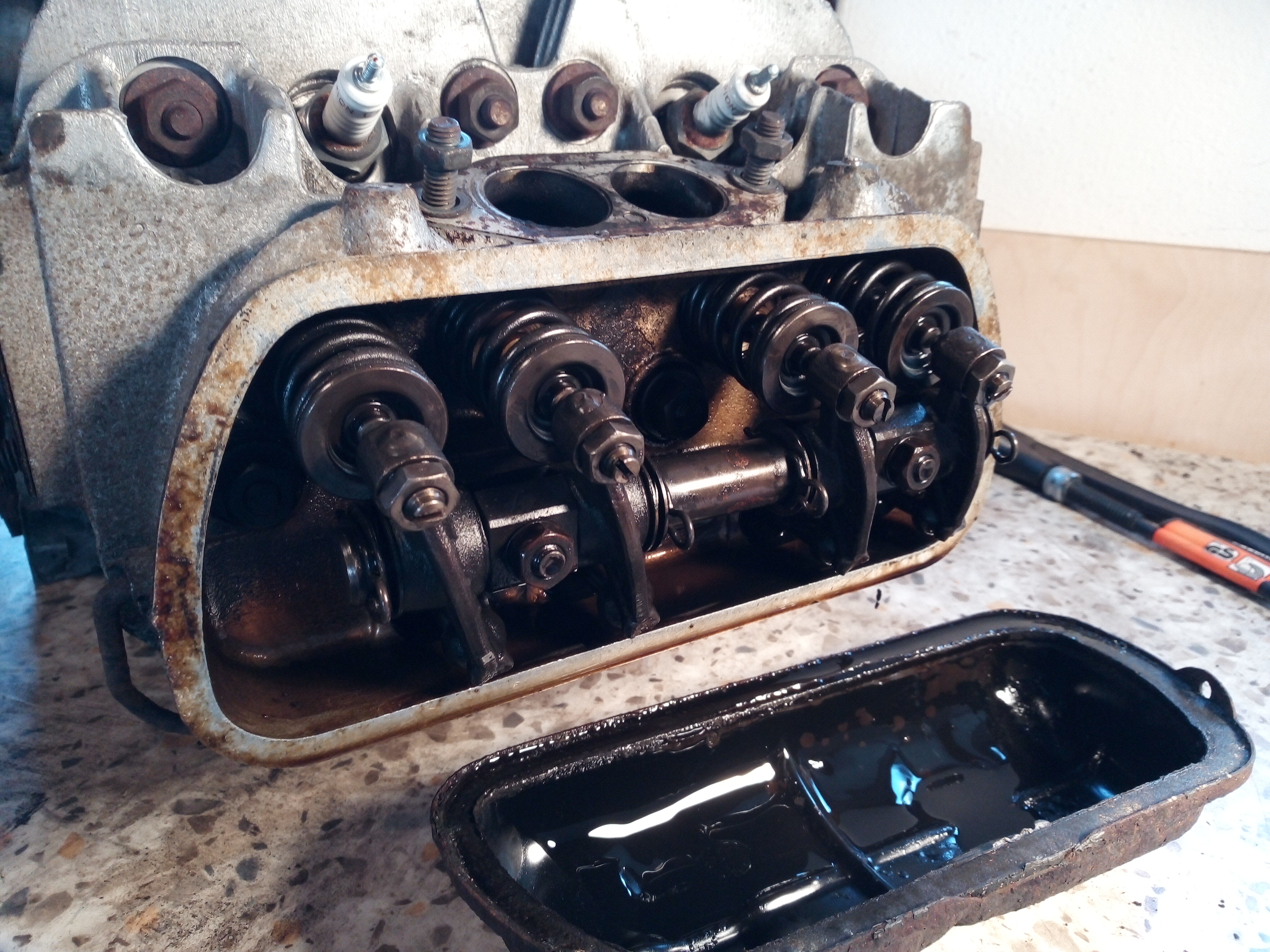 Viel Liebe hat dieser Motor wohl eher nicht abbekommen. Dennoch, auf den Bildern sieht es schlimmer aus als es ist, die Kipphebel sind in einem vernünftigen Zustand.