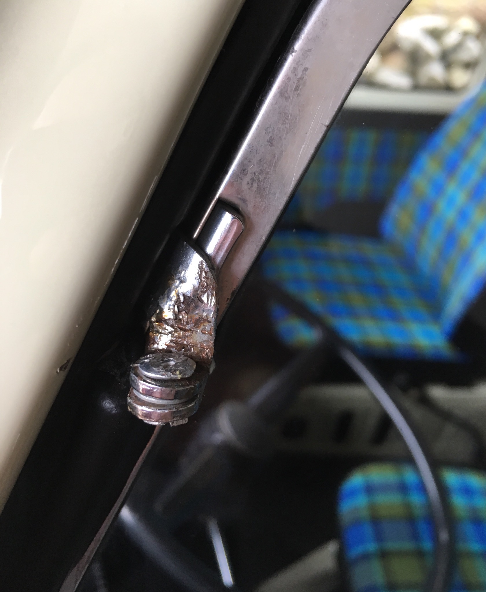 Der Öffnungshebel meines Dreiecksfenster ist ab. Die Vernietung ist gebrochen. Um es zu reparieren muss die eingeklebte Scheibe aus dem Chromrahmen entfernt werden.