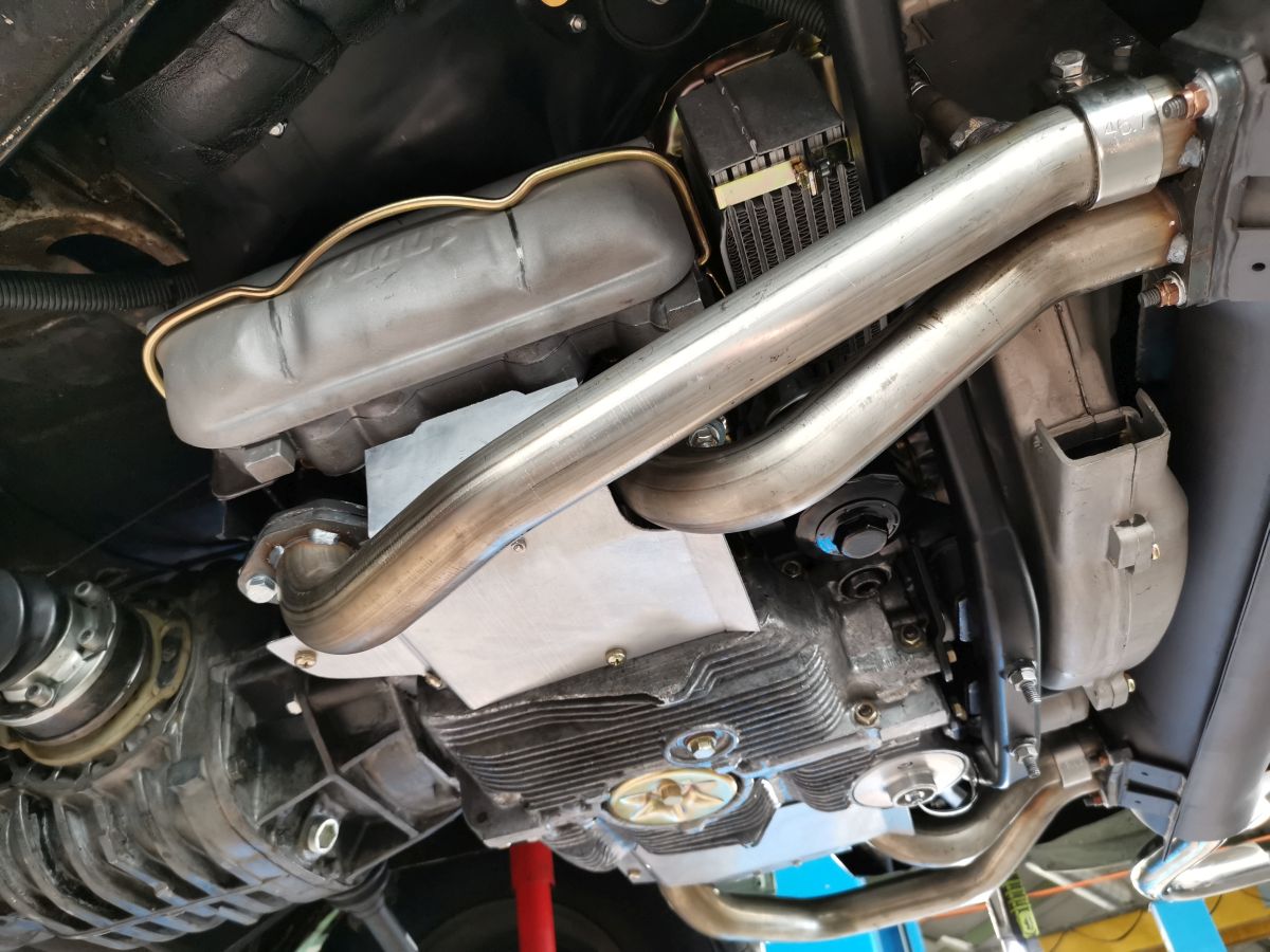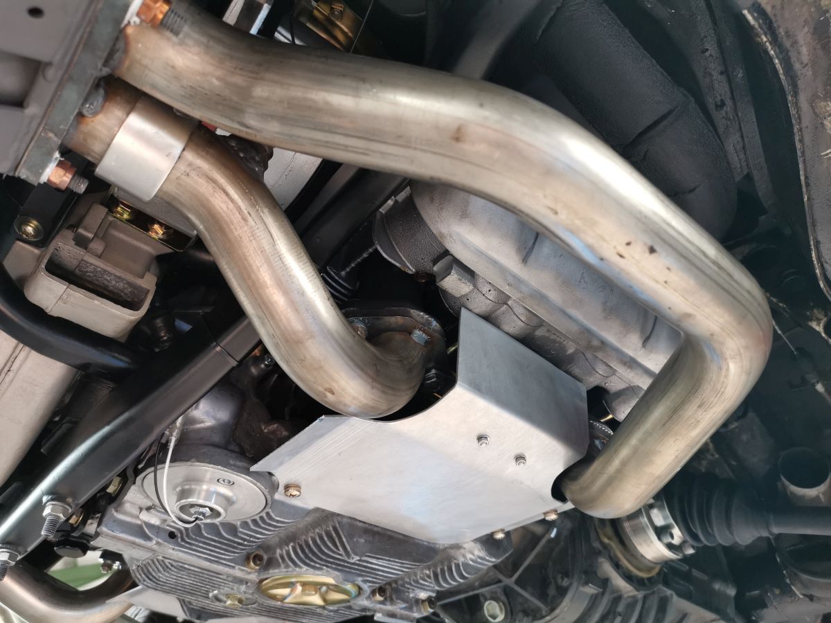 Im vorderen Bereich kamen die Luftleitbleche der US-Abgasanlage zum Einsatz und zusätzlich habe ich zwei Alubleche angefertigt, die die Luftführung nach unten und zur Seite übernehmen. Diese schirmen die Strahlungswärme der Krümmer auch etwas von den Zylindern ab. Auf der Aufpuffseite sind die Rohre noch über Rohrschellen an dem Lima-Halter und dem Gebläsekasten befestigt.