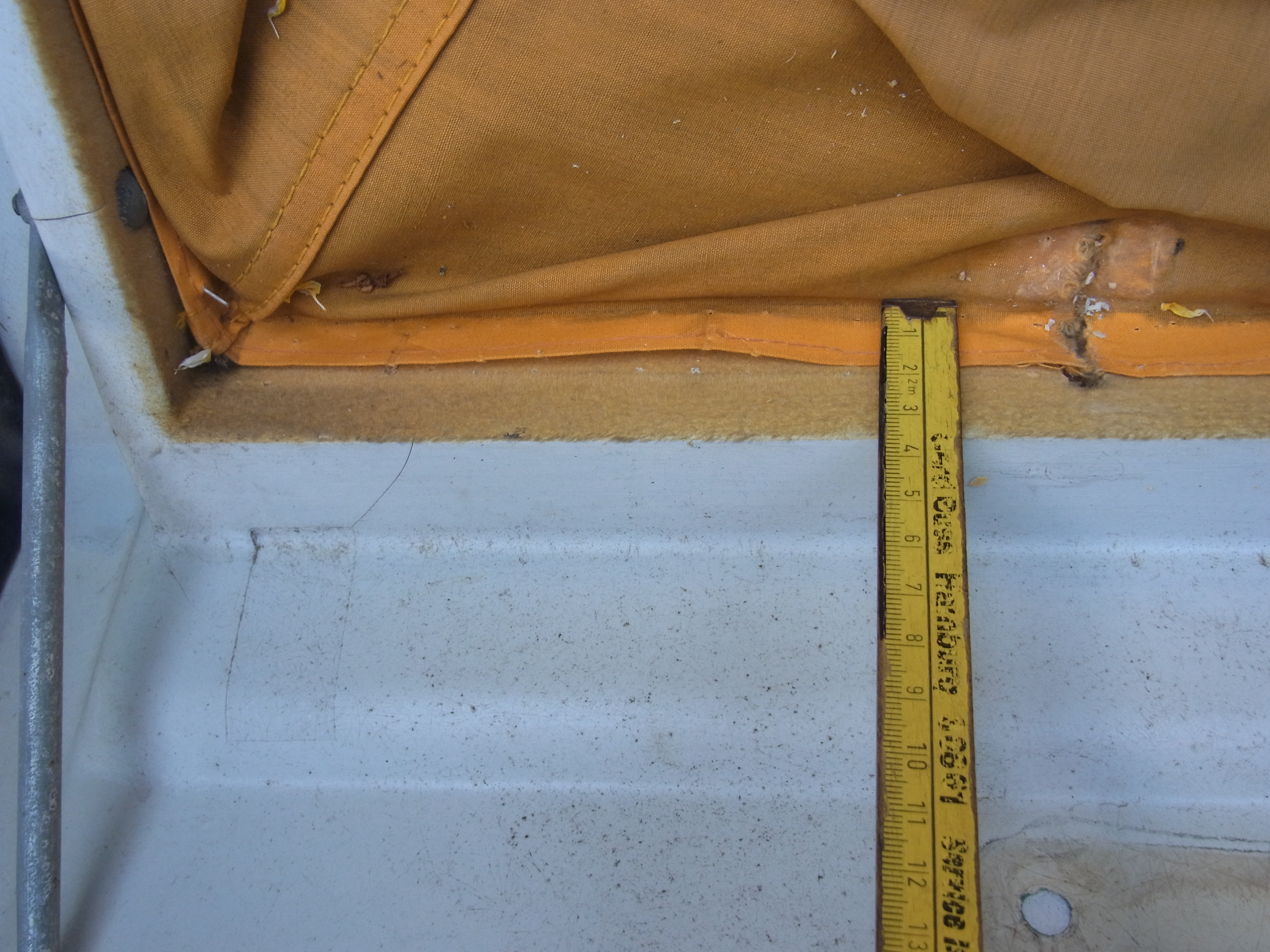 Ich habe bei Stöbern hier verstanden, dass man es erst an das ausgebaute Hubdach mit dem breiten Kader tackert und es dann im eingebauten Zustand unten befestigt. Da der Stoff aber unten einen Keder hat, kann ich ihn ja nicht auf das richtige Mass spannen. Der weisse Keder sitzt unten direkt hinter der Alu- Schiene.