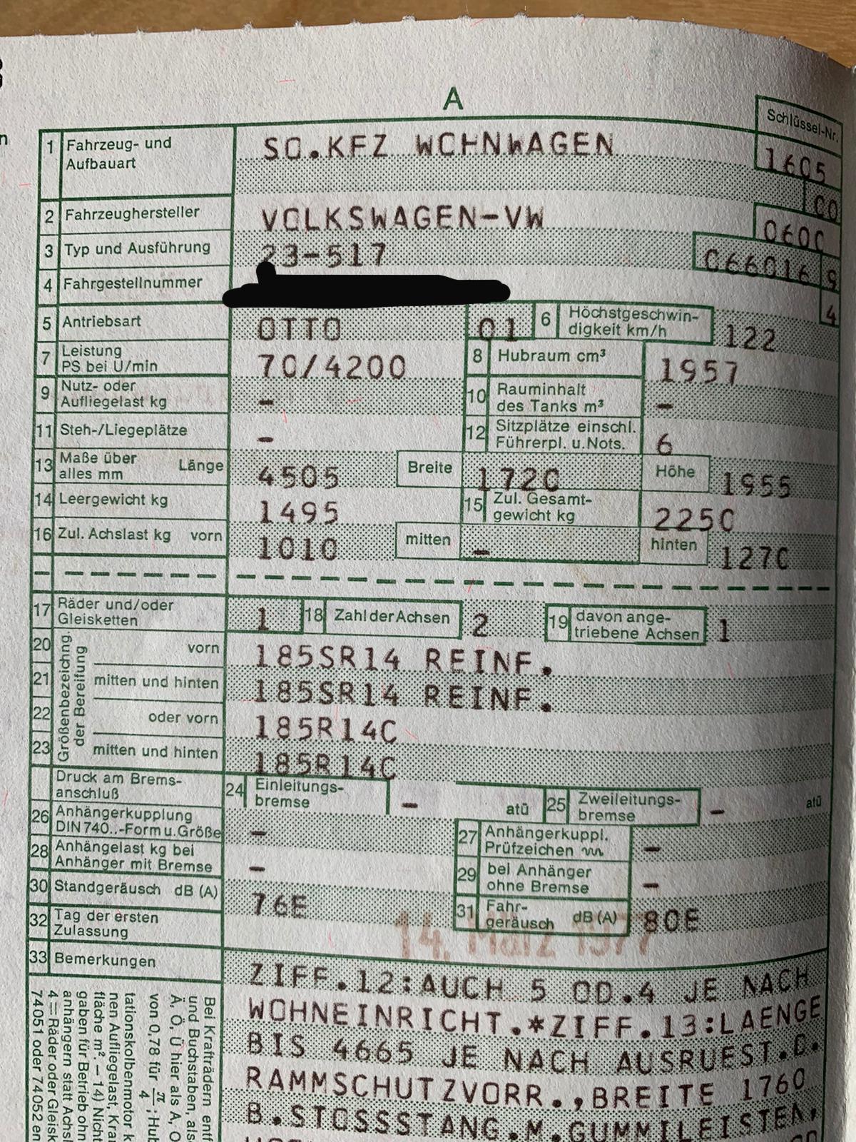 Kann man sich das denn einfach so wünschen? Mein Westy ist von 1977 und im originalen Brief steht ja SO.KFZ WOHNWAGEN. Und Gasheizung und Kocher sind ja auch drin.
