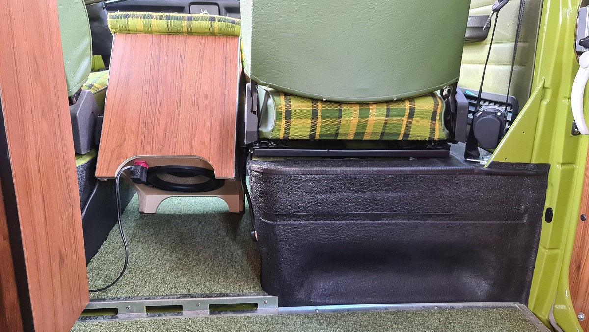 Den Tiefton übernimmt ein downfire Subwoofer im Design des Westfalia Hockers zwischen den Sitzen, der gleichzeitig Staufach mit Becherhalter, sowie Mittelarmlehne ist. Er hat ein 3m Kabel, damit man ihn flexibel im Bus positionieren kann.