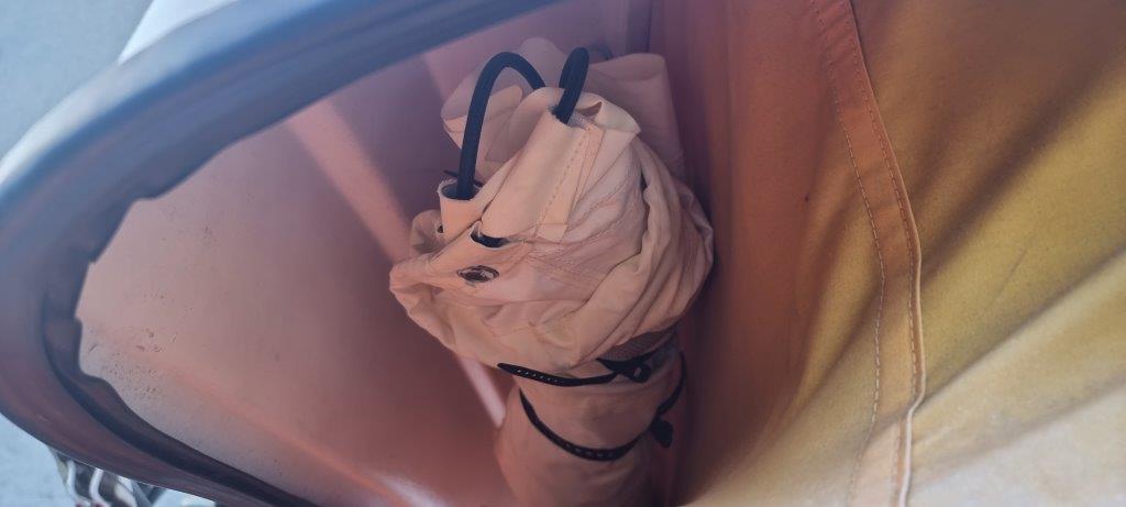 der Regenschutz ist immer dabei und auch hinten unter dem Dach untergebracht.