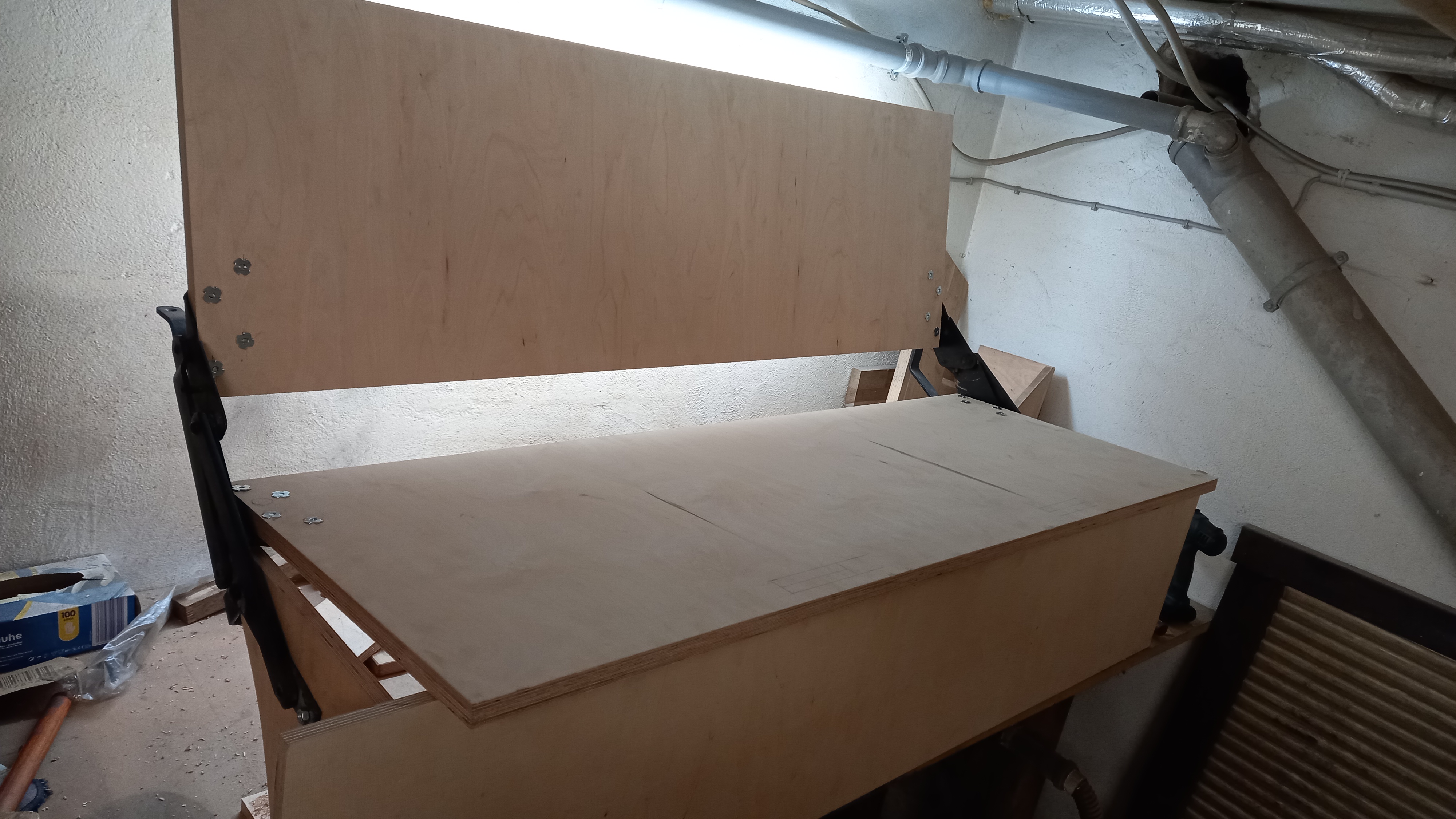Die Bank nähert sich der Vollendung, wobei das größte Problem war die 21er Multiplex Platten für Sitz und Lehne zu bekommen. Überall Mangel...