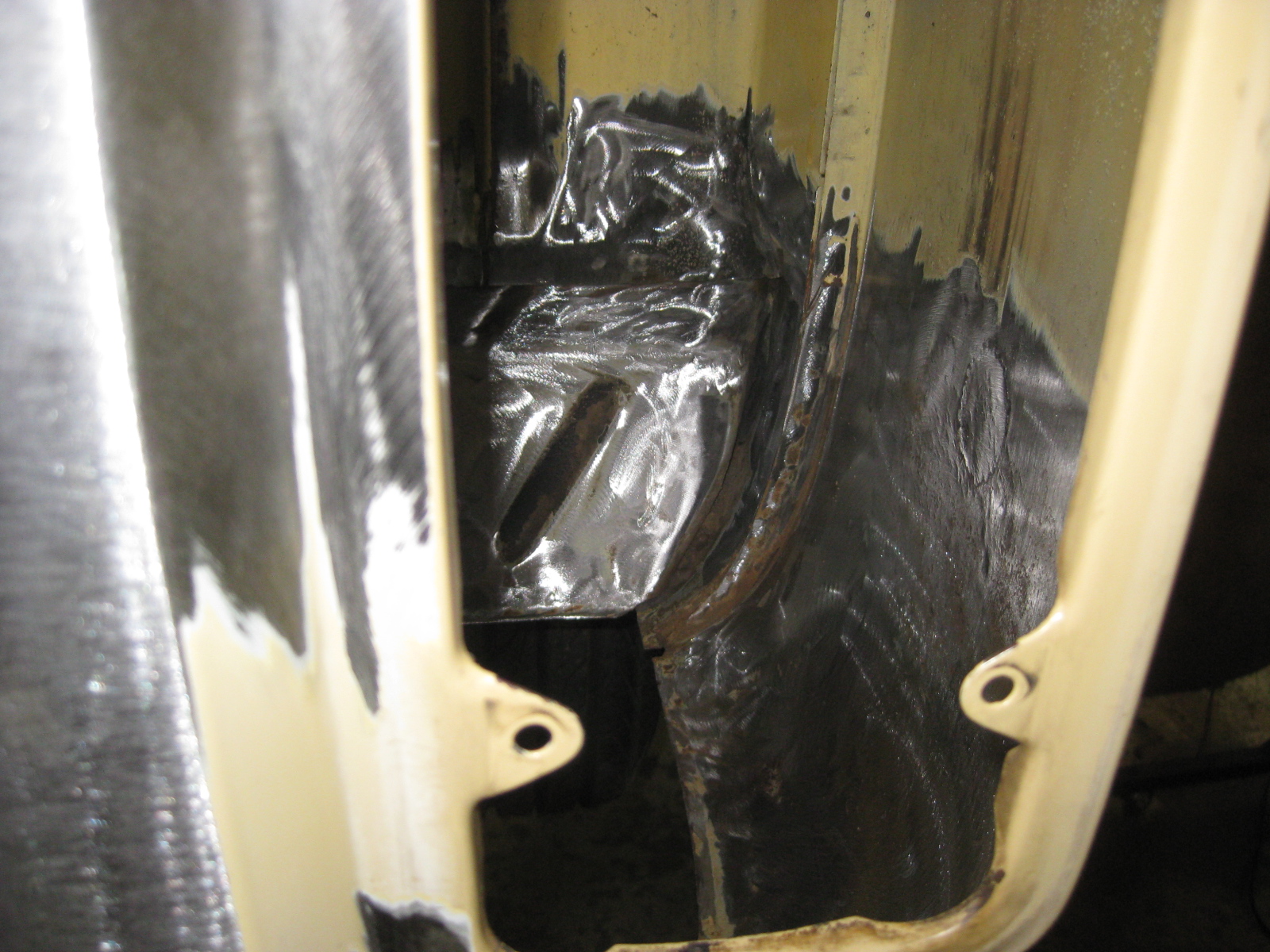 Beifahrerseite Reparaturblech verbeult, so etwas schweißt man nicht ein. Und im hinteren teil dieser Schweißarbeit: Das spar ich uns
