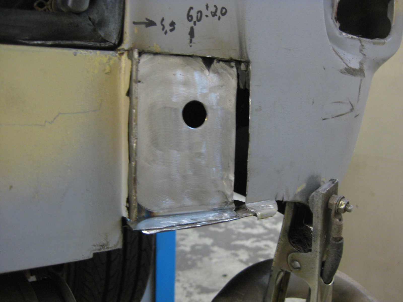 Beifahrerseite Reparaturblech verbeult, so etwas schweißt man nicht ein. Und im hinteren teil dieser Schweißarbeit: Das spar ich uns