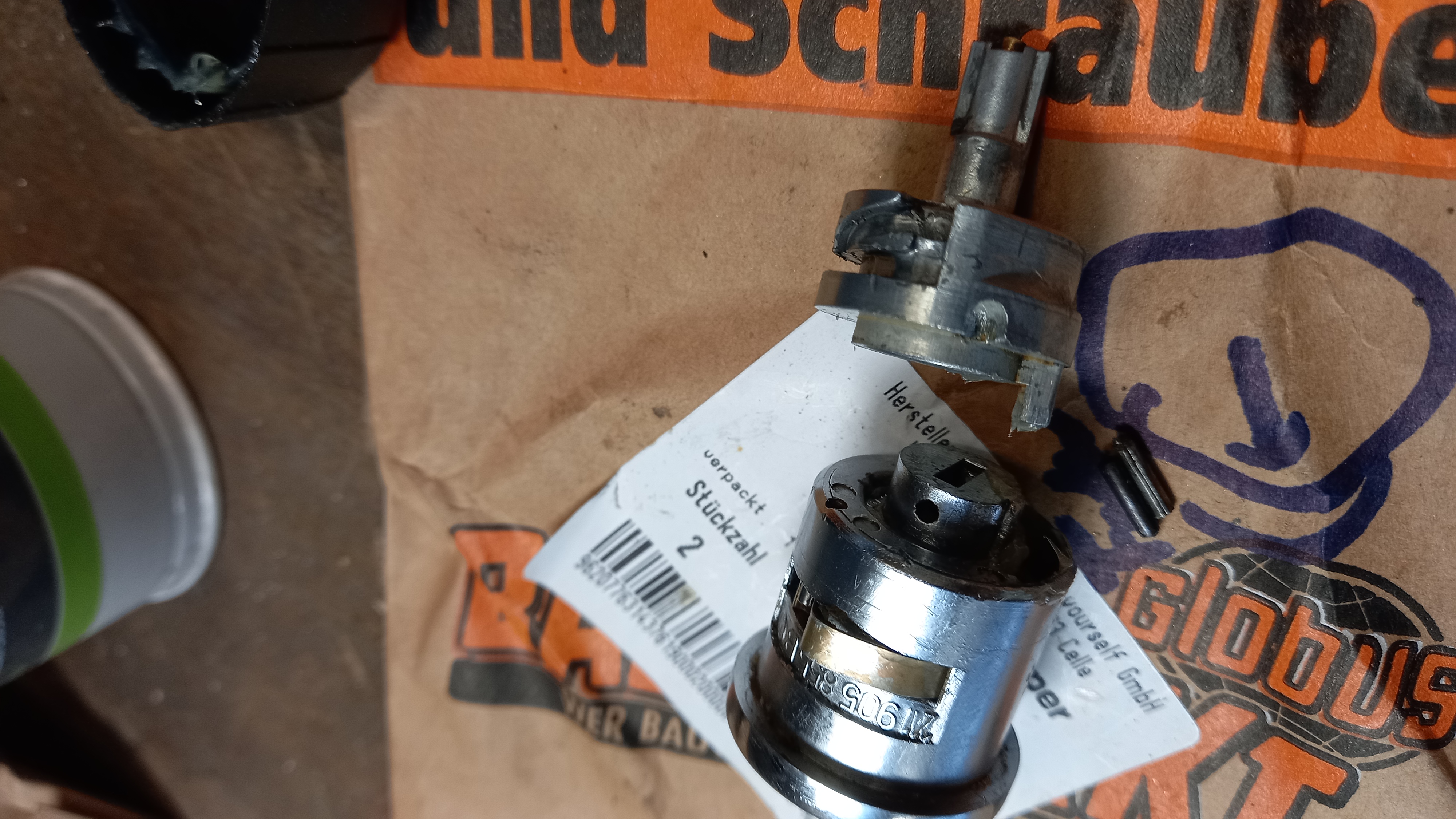 Auf dem letzten Treffen habe ich für kleines Geld ein komplettes Zündschloss mit Gehäuse geschossen, mit dem schönen alten Schloss mit Chromrand.