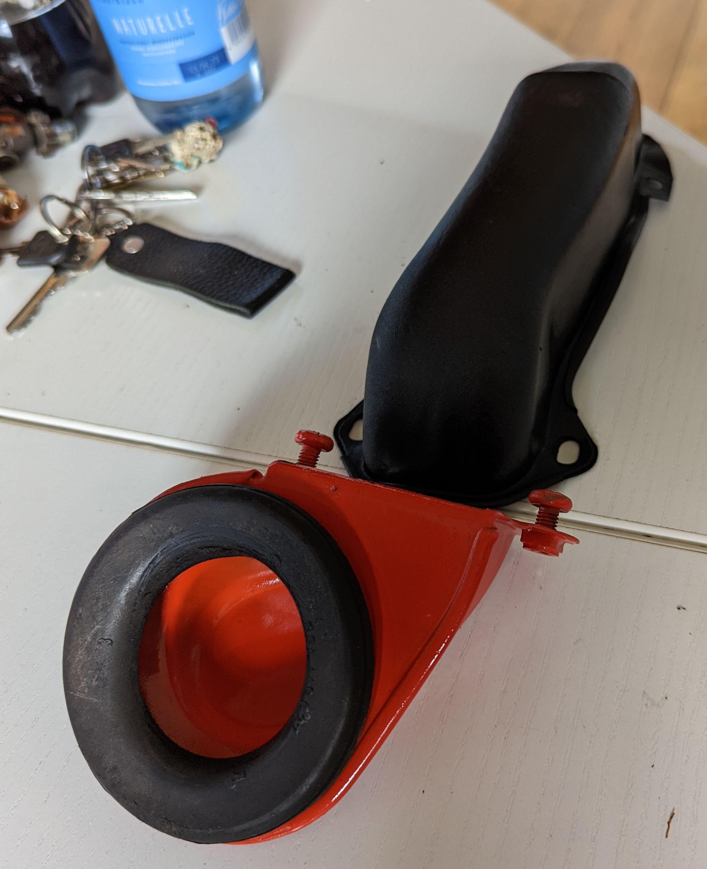 Zwischen dem schwarzen! rohrbogen und dem orangenen Trichter steckt da normalerweise noch die hintere motorverkleidung Richtung Getriebe.