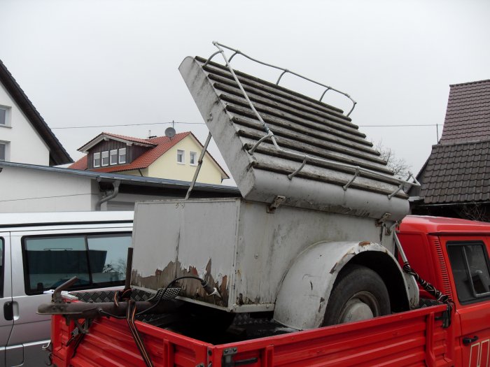 org. 66er Westfalia Hänger mit Aludeckel und Reling . Einfach beim Schrott. Da mein Schrotti ja normalerweise sich mit dem Wert alter Dinge auskennt dachte ich naja der wird teuer.
