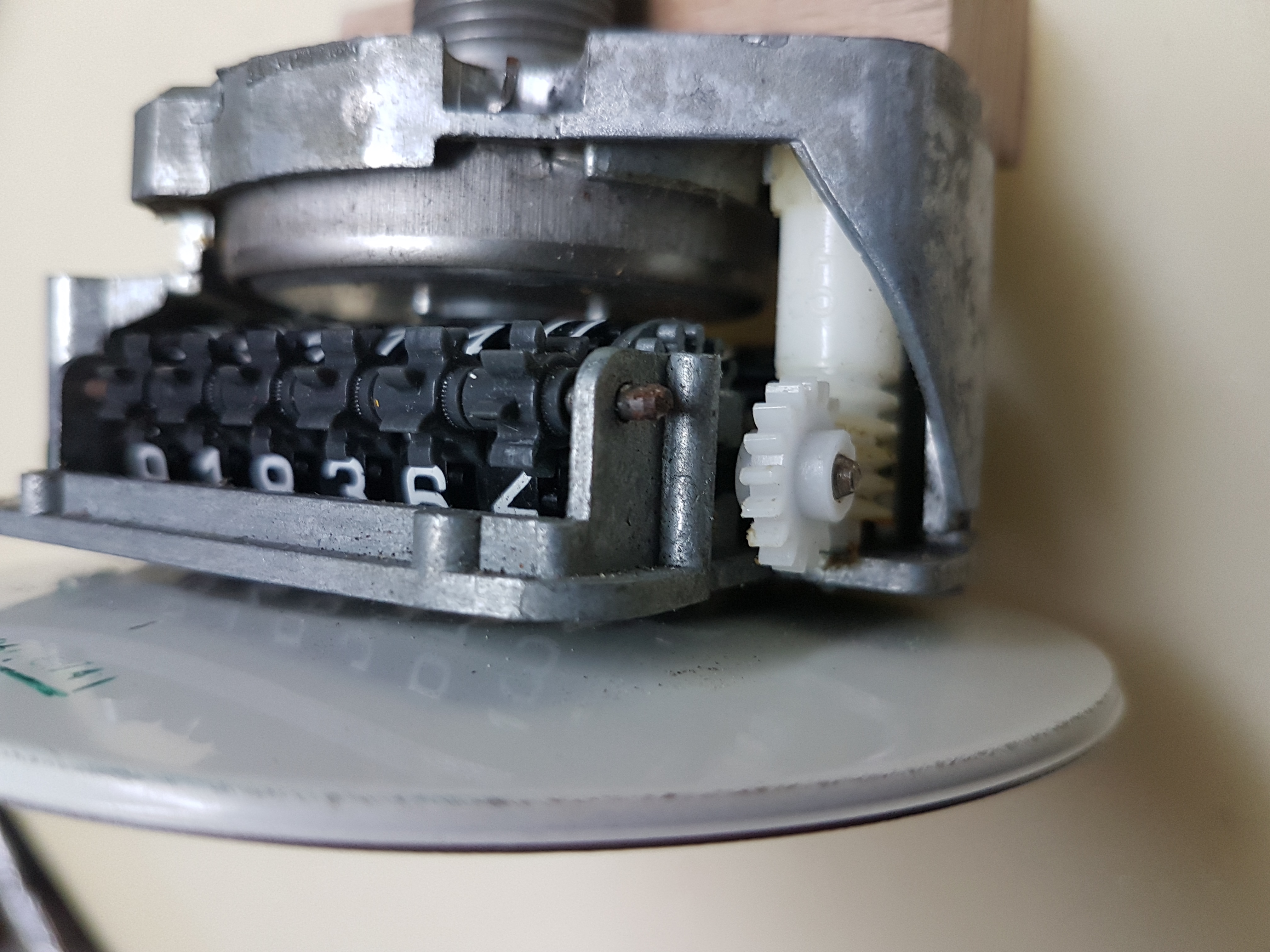 Sieht man vom Flansch in das Zählwerk, erkennt man noch eine, wie im Uhrwerk gedrehte Feder. Das Ganze ist so filigran, dass ich nicht glauben kann, dass man den Zeiger hätte abziehen können. Für heute hab' ich erst mal genug; es wäre wohl doch besser gewesen, jemand da dran zu lassen, der sich darauf versteht.
