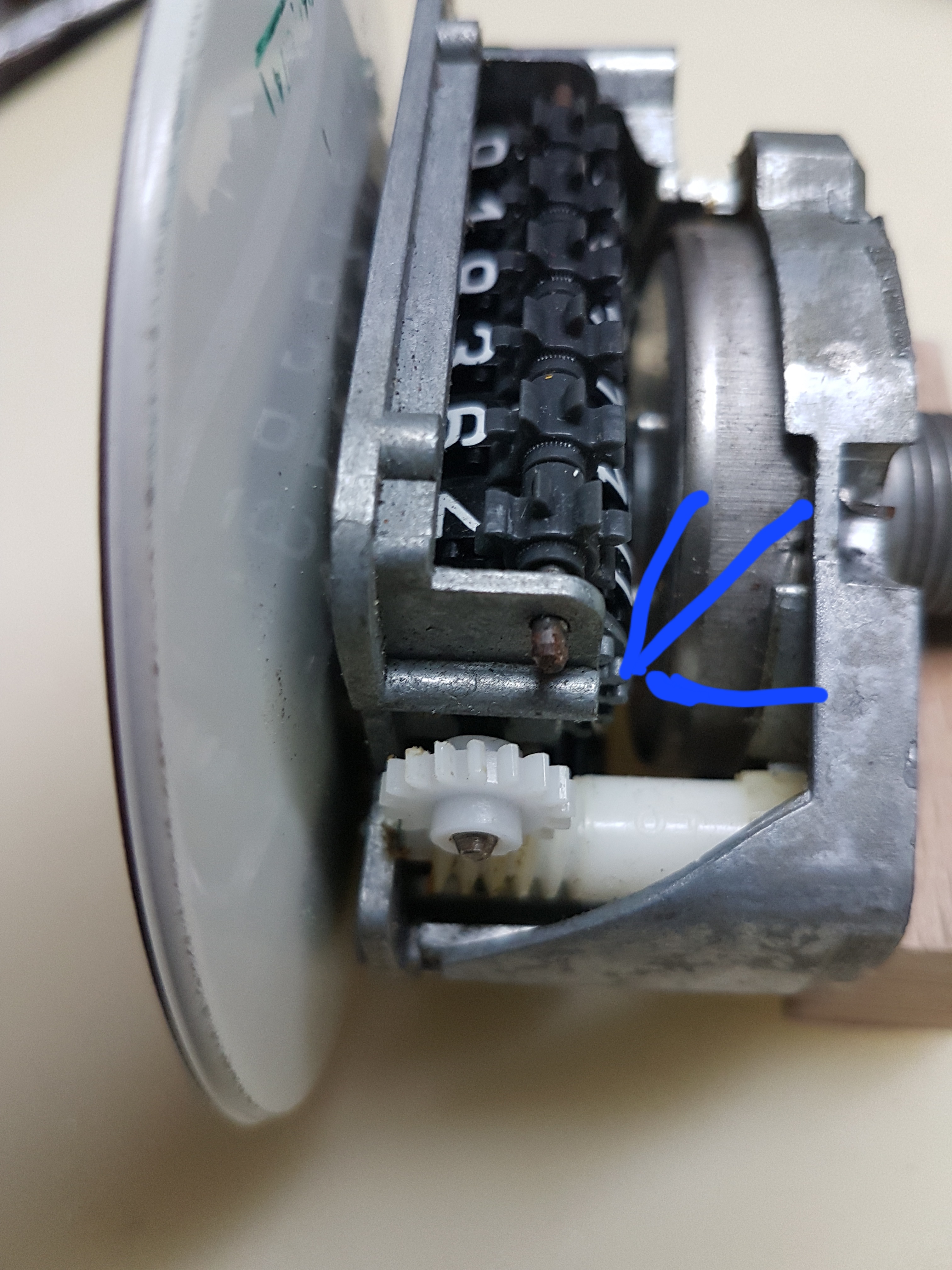 Sieht man vom Flansch in das Zählwerk, erkennt man noch eine, wie im Uhrwerk gedrehte Feder. Das Ganze ist so filigran, dass ich nicht glauben kann, dass man den Zeiger hätte abziehen können. Für heute hab' ich erst mal genug; es wäre wohl doch besser gewesen, jemand da dran zu lassen, der sich darauf versteht.