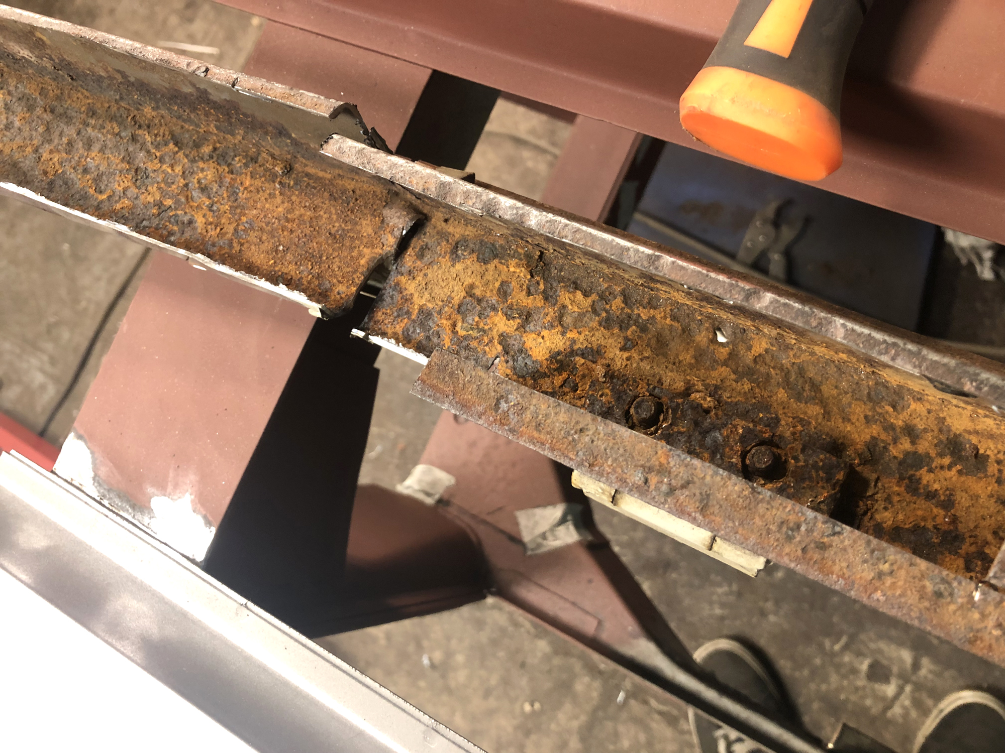 Nach Entfernen des Teils habe ich erstmal innen alles einrostet und grundiert. Ca. 100 Schweißpunkte später war der neue Träger dann an seinem Platz.