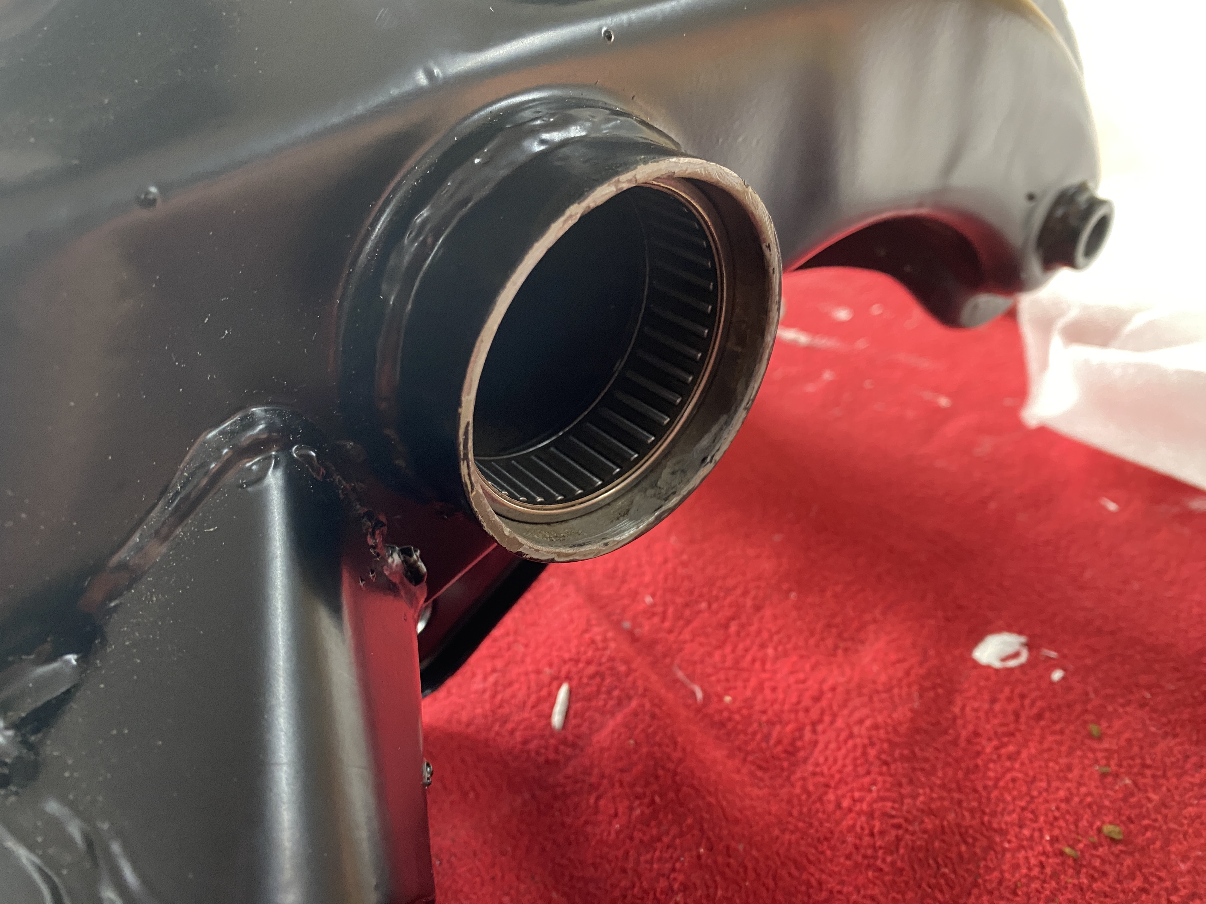 Die „Dichtkappe“ soll zwischen der Dichtung der Tragarmen und der Achse sein. Siehe Bilder