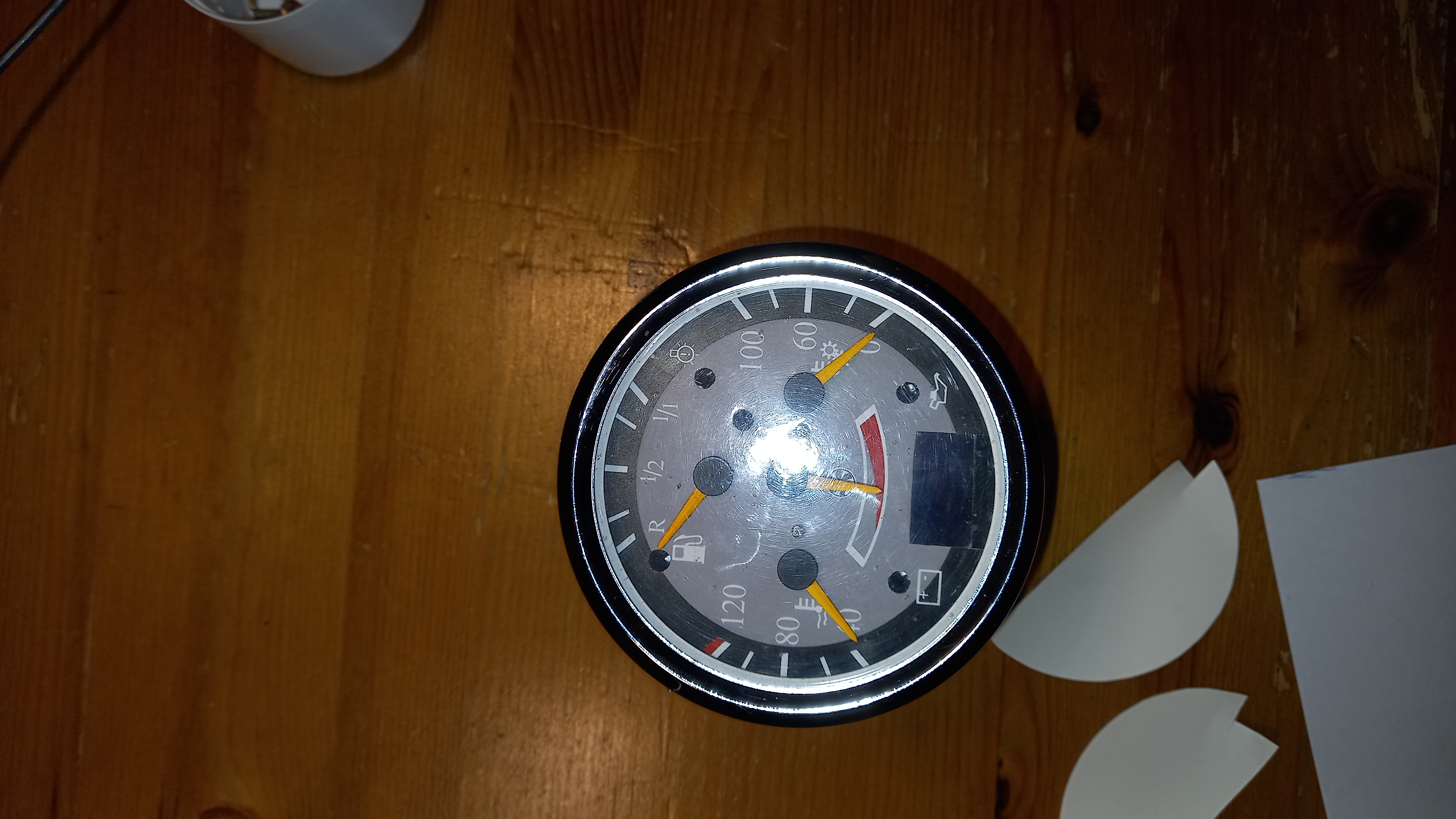 Da ich das Design ändern wollte, und mich bezüglich der Technik von dem von Thomas angebotenen Drehzahlmessern mit Uhr aus alten Mercedes lassen habe fünf ich also am zu basteln. Das wichtigste ist bei mir das Multifunktionsanzeigeding, da ist allerdings von Mercedes nichts mehr als die Nadeln übrig geblieben, den ganzen Rest habe ich bei gebaut.