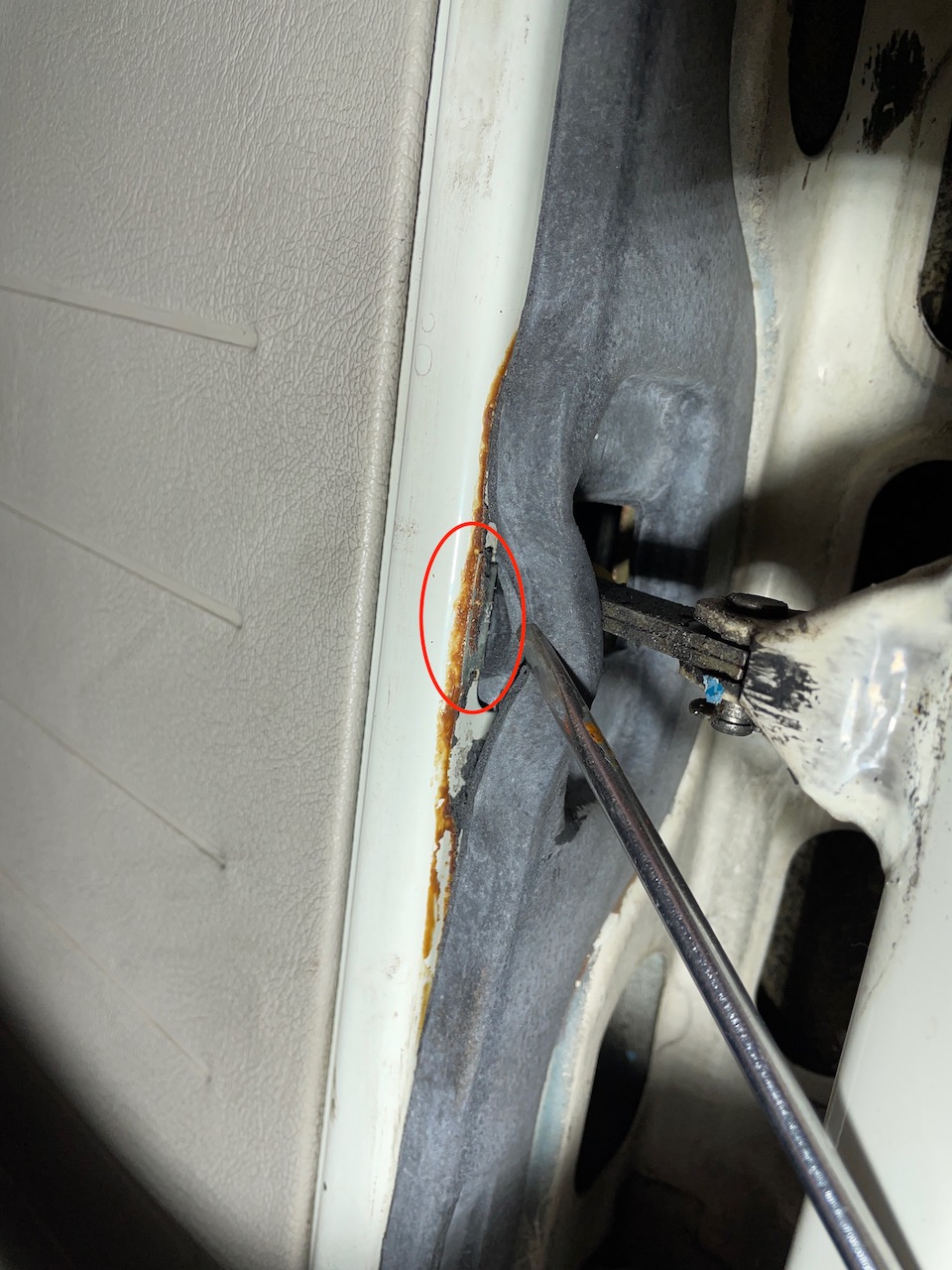 Bei der Fahrertür, die mit der neuen Dichtung eigentlich schon gut zu ging, war die Klammer auch noch da, nur mit weniger Auswirkungen auf das Verhalten der Türdichtung.