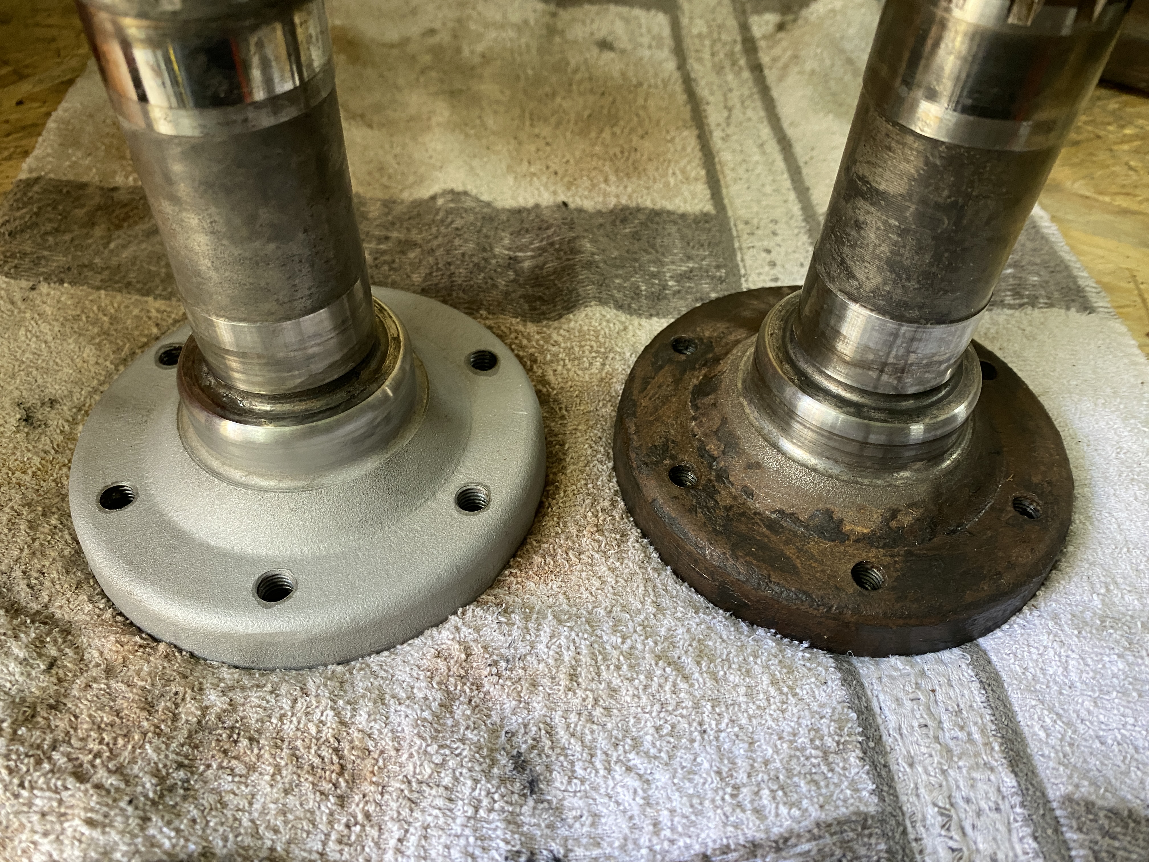 So wieder einiges passiert in den letzten Wochen. Alles neu gepulvert, zusätzlich angeschliffen und dann noch mit Brantjo Korrux 3in1 lackiert um alles besser am Unterboden zu schütze. Die oberen Traggelenke an der Vorderachse einzubauen habe ich bisher selbst mit 2 Leuten noch nicht hin bekommen wegen der Vorspannung der neuen Federstäbe.