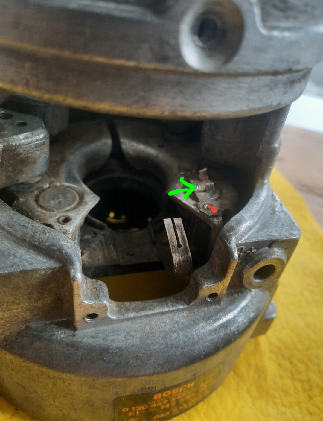 Hallo zusammen. Da ich dabei bin mir einen Typ 1 Motor aufzubauen muß ich natürlich auch die Peripherie fertig machen. Aktuell überhole ich eine mal eingelagerte Lima. Diese hat irgendwie nicht mehr geladen. Komisch? Die Lager hab ich schon alle ab. Die kommen neu. Allerdings war der B+ Anschluss immer etwas lose. Jetzt weiß ich auch warum. Die Kontermutter hatte sich gelöst und der ganze interne Anschluss hat sich mitgedreht bis er dann abgerissen ist. Jetzt war es mir trotz viel Hitze nicht möglich die eingelöteten Reste zu entfernen. Der "Quetschverbinder" ist zum Teil zerbrochen (grüner Pfeil). Es ist nun nur noch eine Klemmung übrig. Habt ihr eine Idee für die Reparatur? Ach ja. Die Spezialschraube die den B+ Anschluss darstellt ist auch kaputt. Hab überlegt einfach ein dickes Kabel durch das Loch zu stecken mit ner isolierten Flachsteckhülse dran. Das Kabel müsste ich dann an die Reste anschließen/anlöten. Oder kann ich durch das Loch (roter Punkt) ne kleine Schraube durch stecken? Und da einen Flachstecker zum anschrauben befestigen?