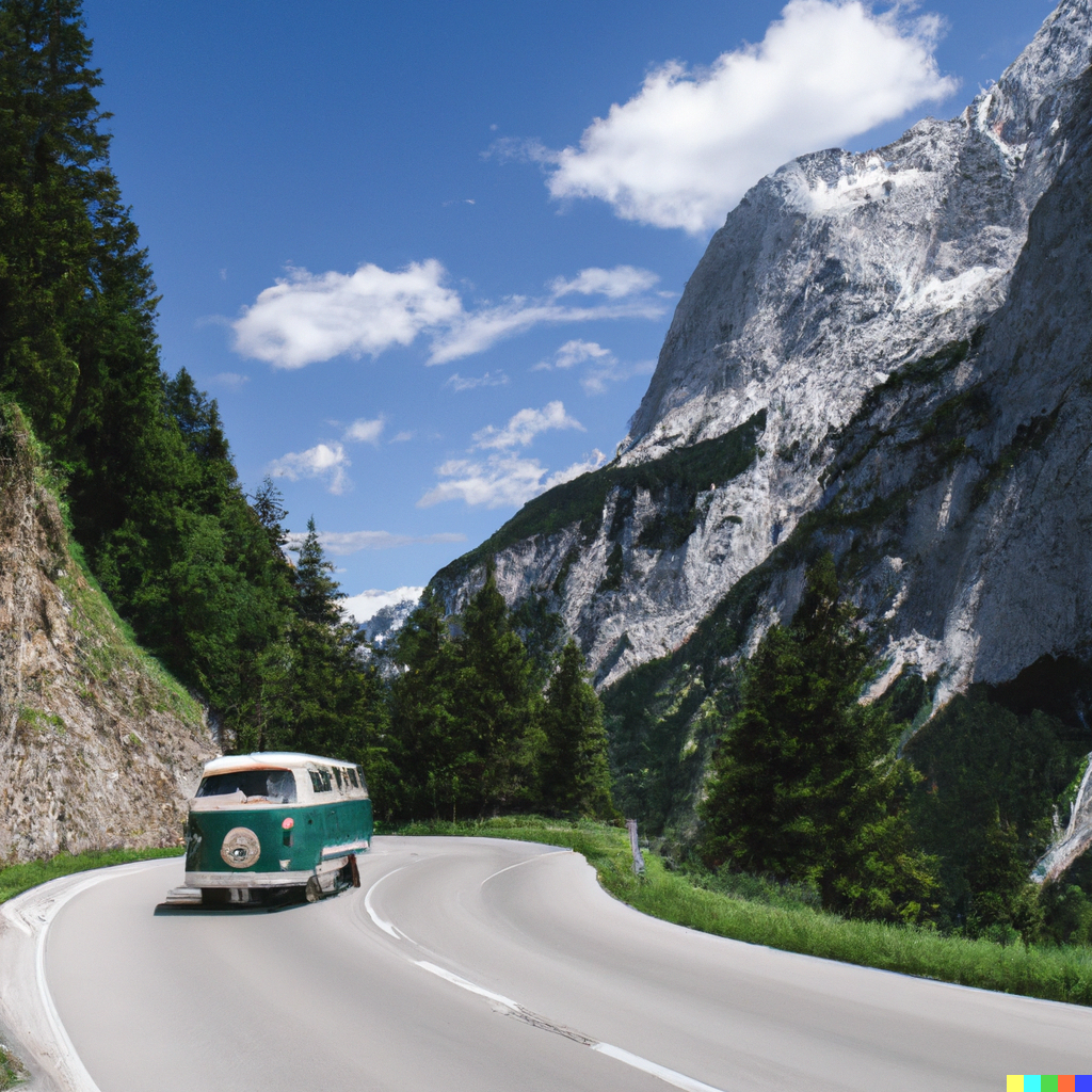 DALL·E 2023-03-04 17.39.27 - a vintage volkswagen bus t2 camper driving down a mountain offroad.png