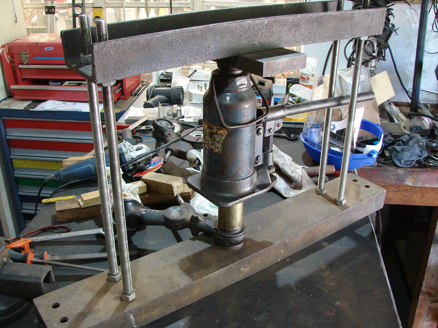 Anfangs war nicht klar, wieviel Tonnen Kraft ich tatsächlich brauche, um die Gelenke aus den Tragarmen raus und wieder rein zu kriegen. Ein Bekannter von mir hatte einen massiven Rahmen aus U-Stahl und einen 8t-Wagenheber und ich habe ein paar passende Distanzstücke zum Einpressen gebaut. Hat perfekt geklappt. Die alten waren in Ihren Sitzen nicht verrostet und die neuen hatten genau das richtige Übermaß.