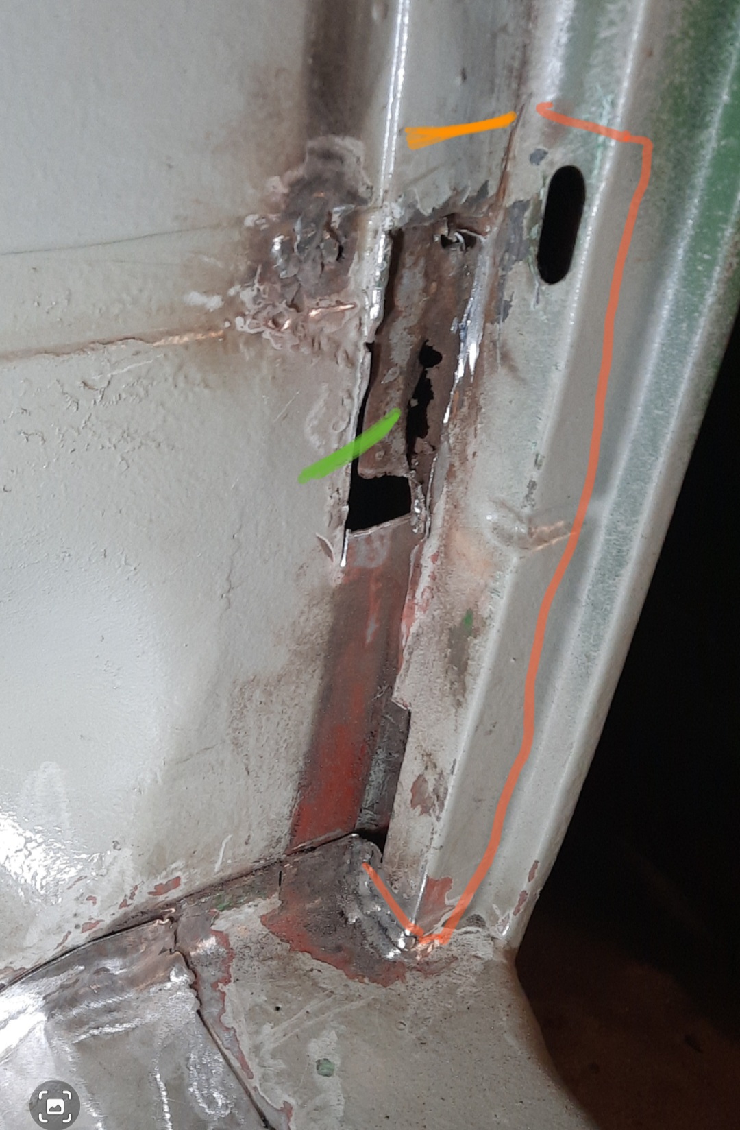 Mal ne Frage. Ich suche ein Foto von der B Säule bei der Schiebetür von innen. Also wie es da aussehen soll. Ich hab ein Teilstück des Ladebodens ersetzt und wollte nur die Ecke n bisschen schön machen...dann kam die nächste Baustelle zum Vorschein. Habt ihr ne Idee für die Reparatur? Hab überlegt die B-Säule zu öffnen wie eingezeichnet und dann weiter zu schauen. Grün markiert ist schon das Kniestück. Ist das mit einem Deckel verschlossen oder sind das Reste der B-Säule und es wurde nur einfach drüber geschweißt? Da sind teilweise 3 Schichten und ich hab grad keine gute Idee...