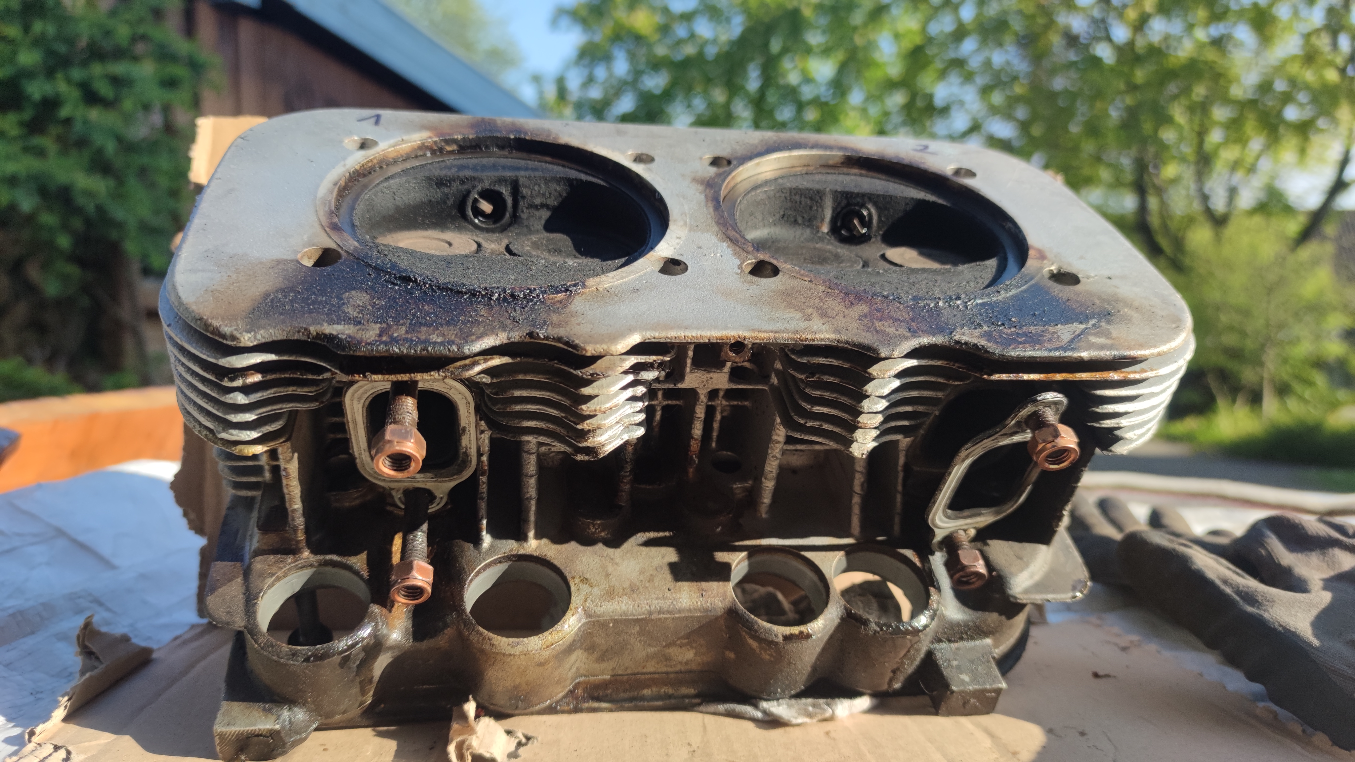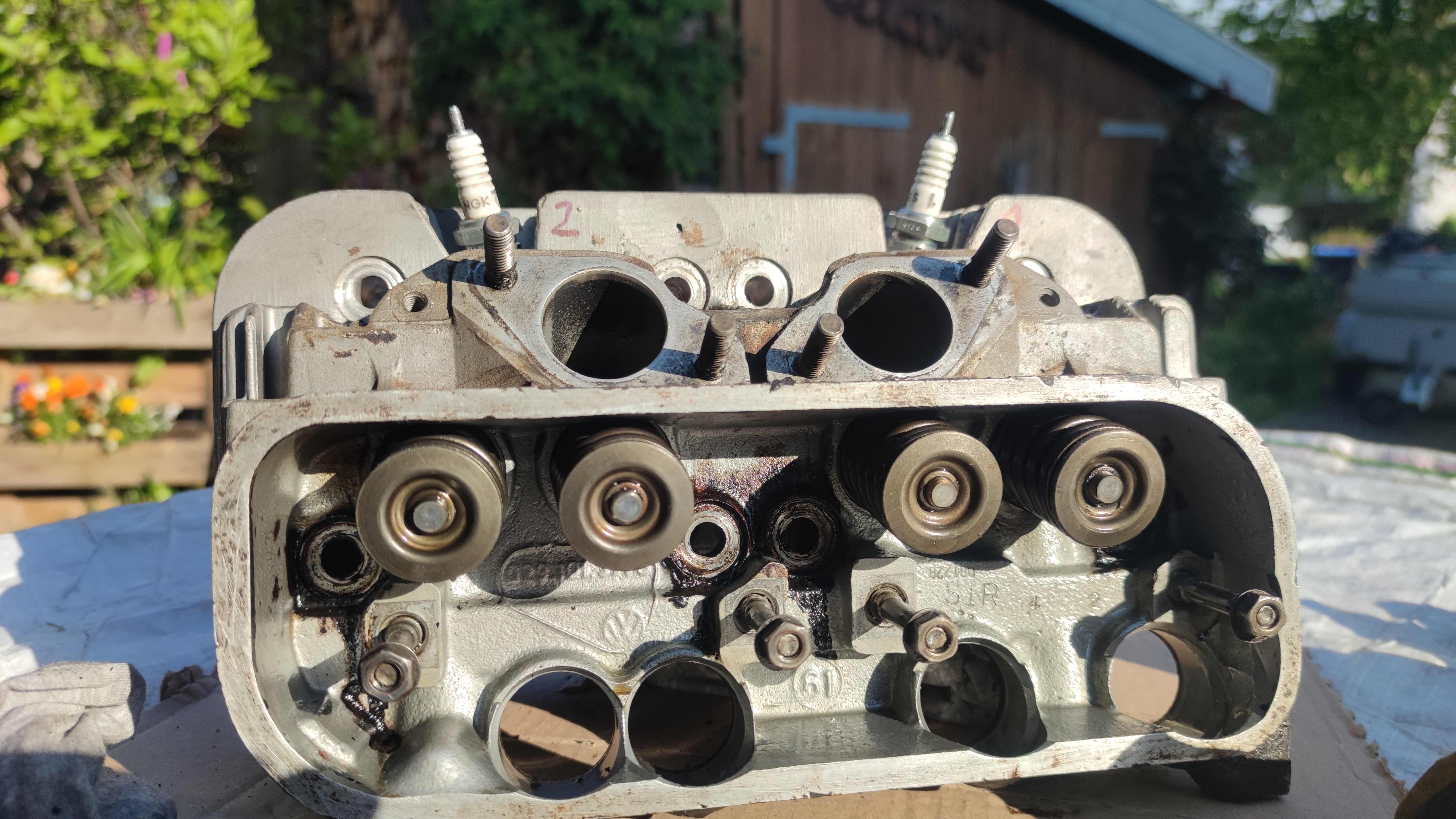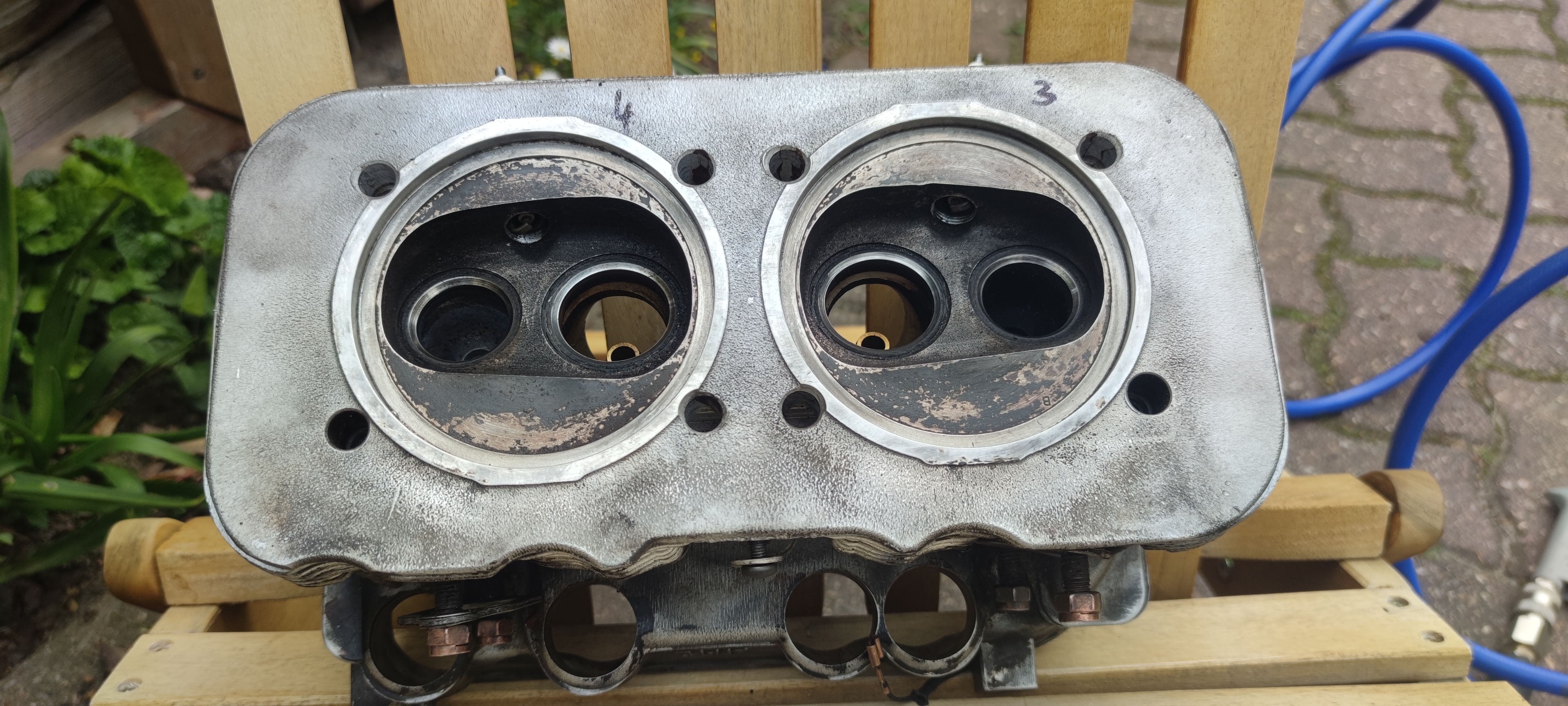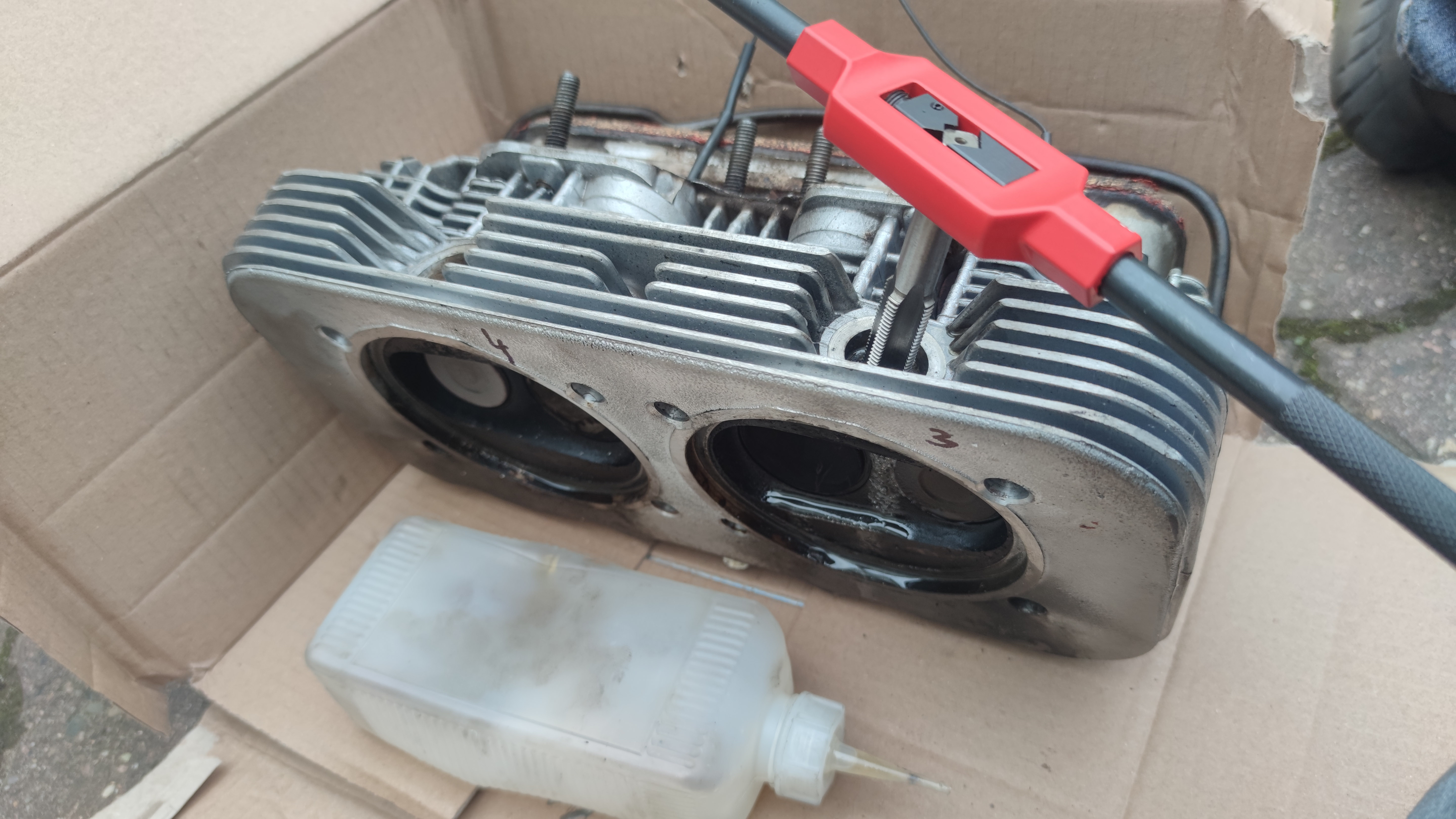 Daraufhin habe ich den linken Zylinderkopf freigelegt und ausgebaut . Da habe ich dann aber auch gesehen , daß ich nach unten hin Undichtigkeiten habe . Ich habe dann aber ersteinmal die Zündkerzen gewinde nachgeschnitten.