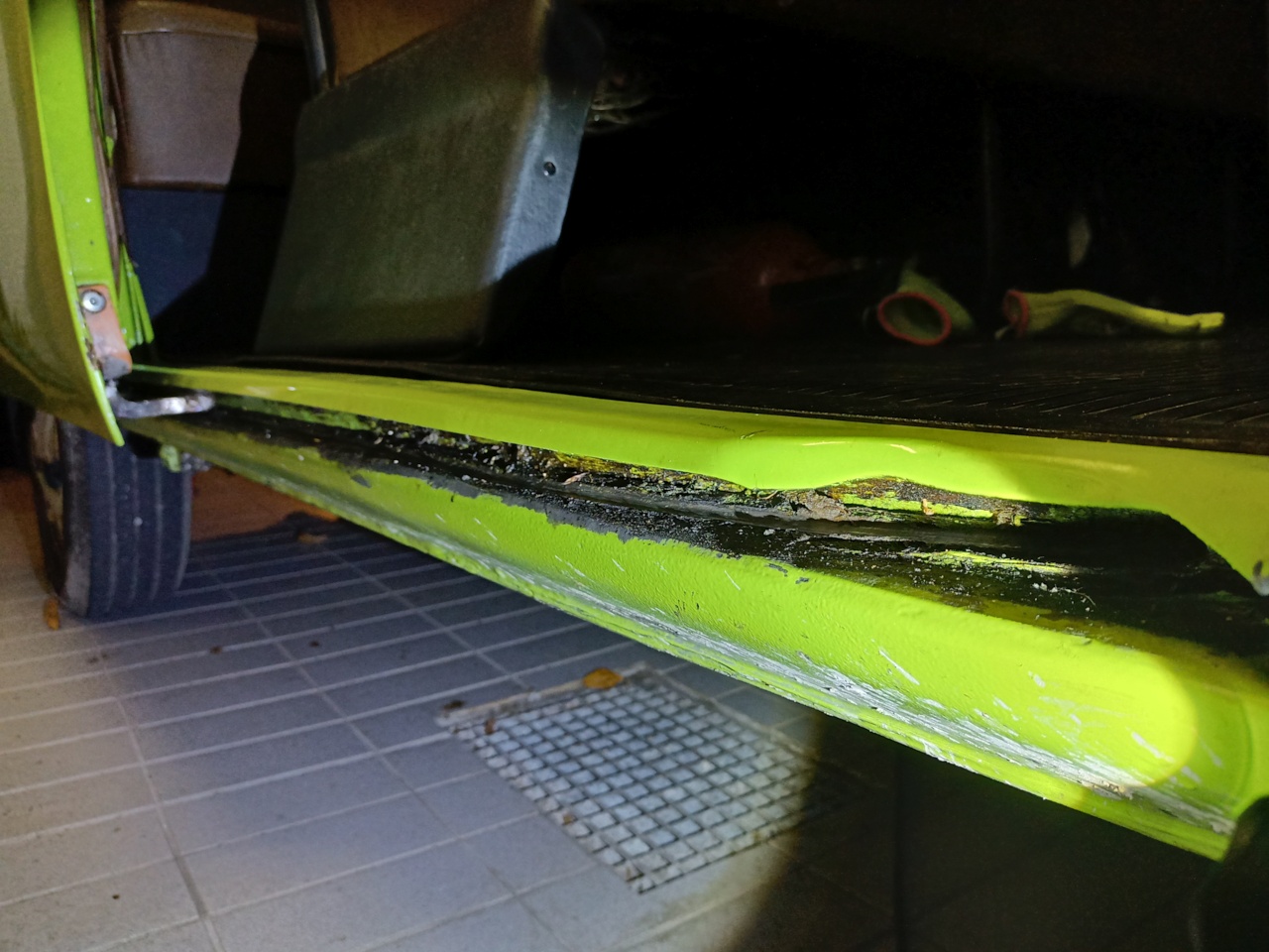 Und die Schweller sind mit Unterbodenschutz aufgespritzt und Spachtelmasse genutzt, denn da fehlen auch die Sicken (Nuten/Vertiefungen/Blechübergänge) unter den Schiebetürenden unten im Schweller. Von den Vorgängern, oder weißt Du selbst was unter der grünen Deckfarbe lauert?