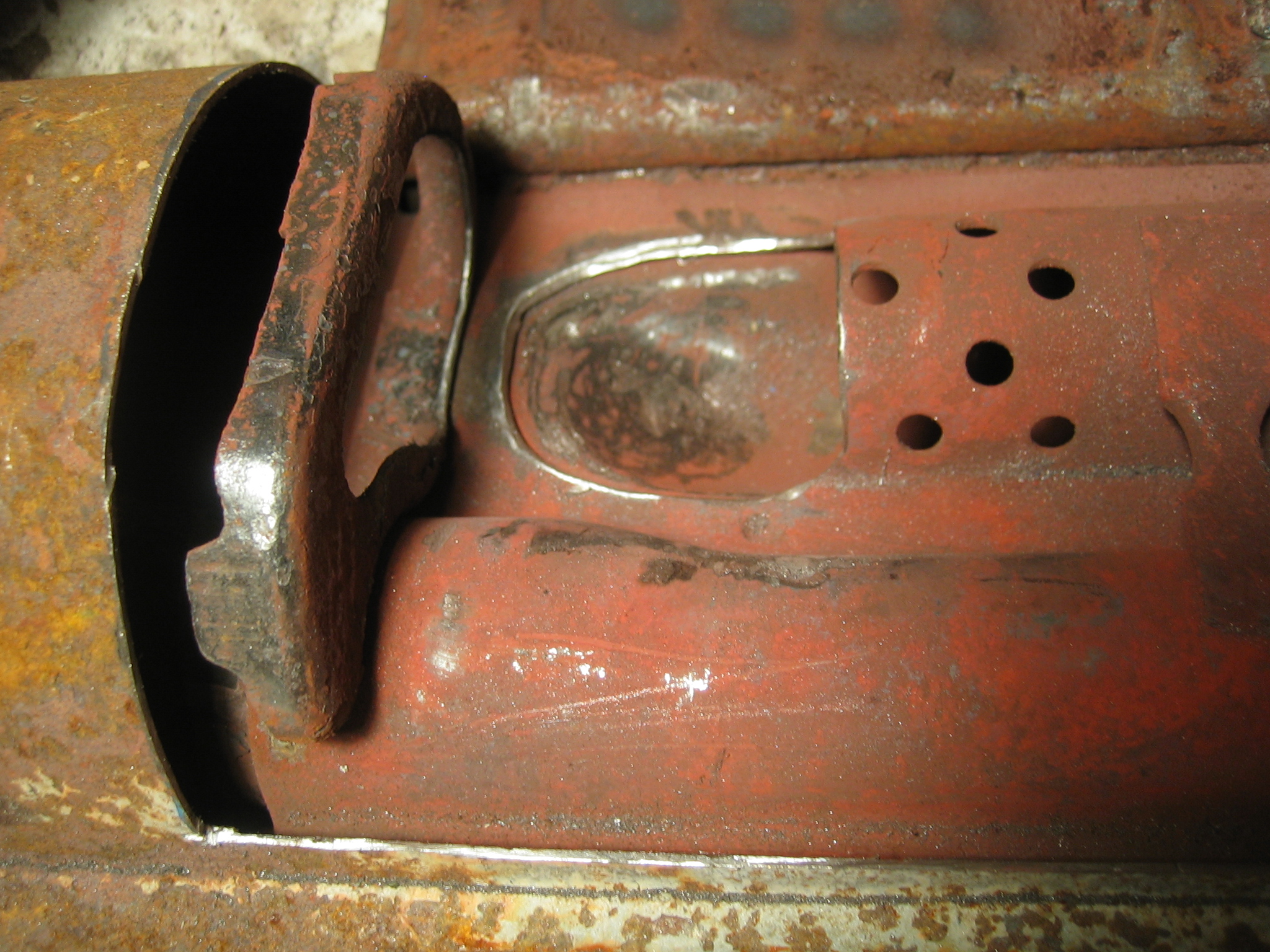 Bei den alten Töpfen kommt man von der (in Fahrtrichtung gesehen) hinteren Seite an alle Kappen. Das ist bei diesem späten Topf nicht der Fall. Hier befindet sich ein dickes Blech quer in der Mitte, sodass man von hinten nicht heran kommt. Man muß also von vorne aufschneiden, bzw die Stutzen separat heraus trennen um sie modifizieren zu können.