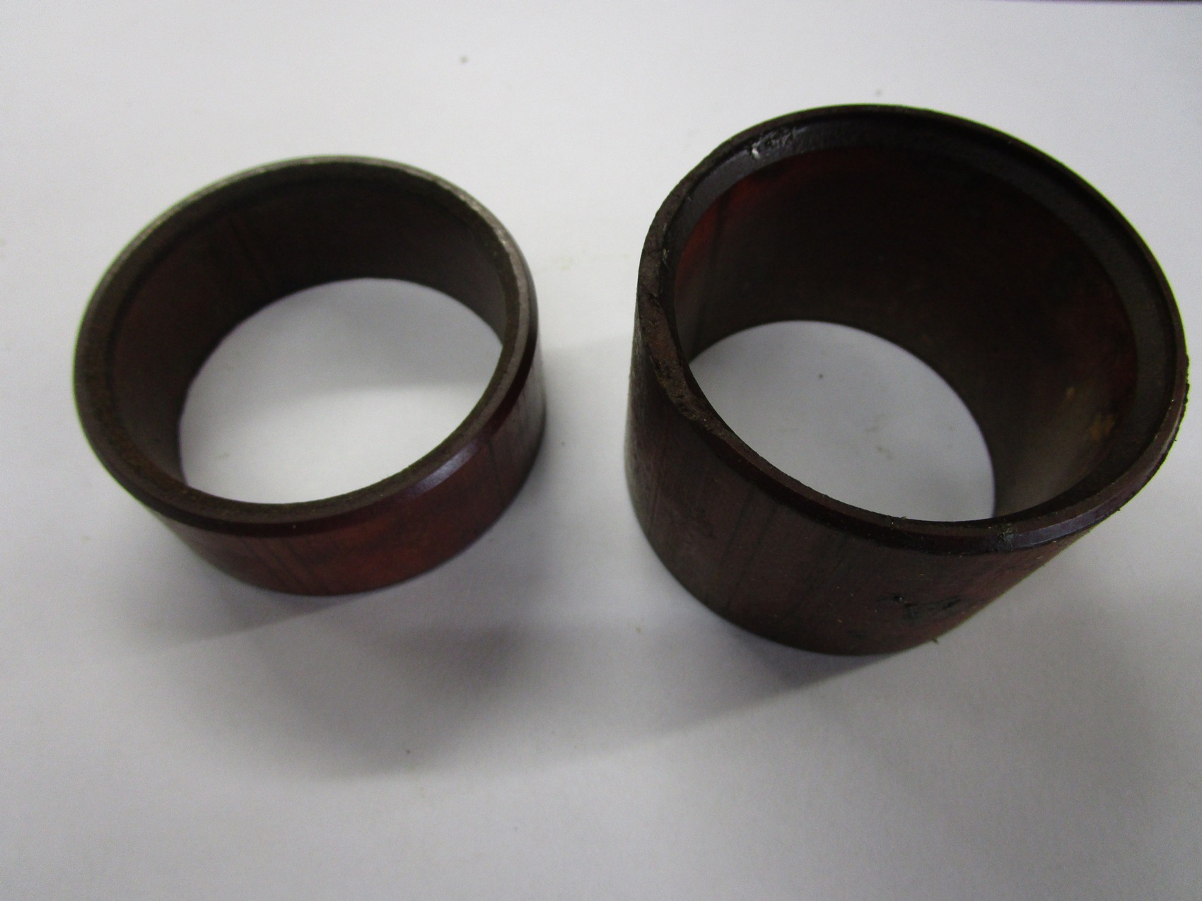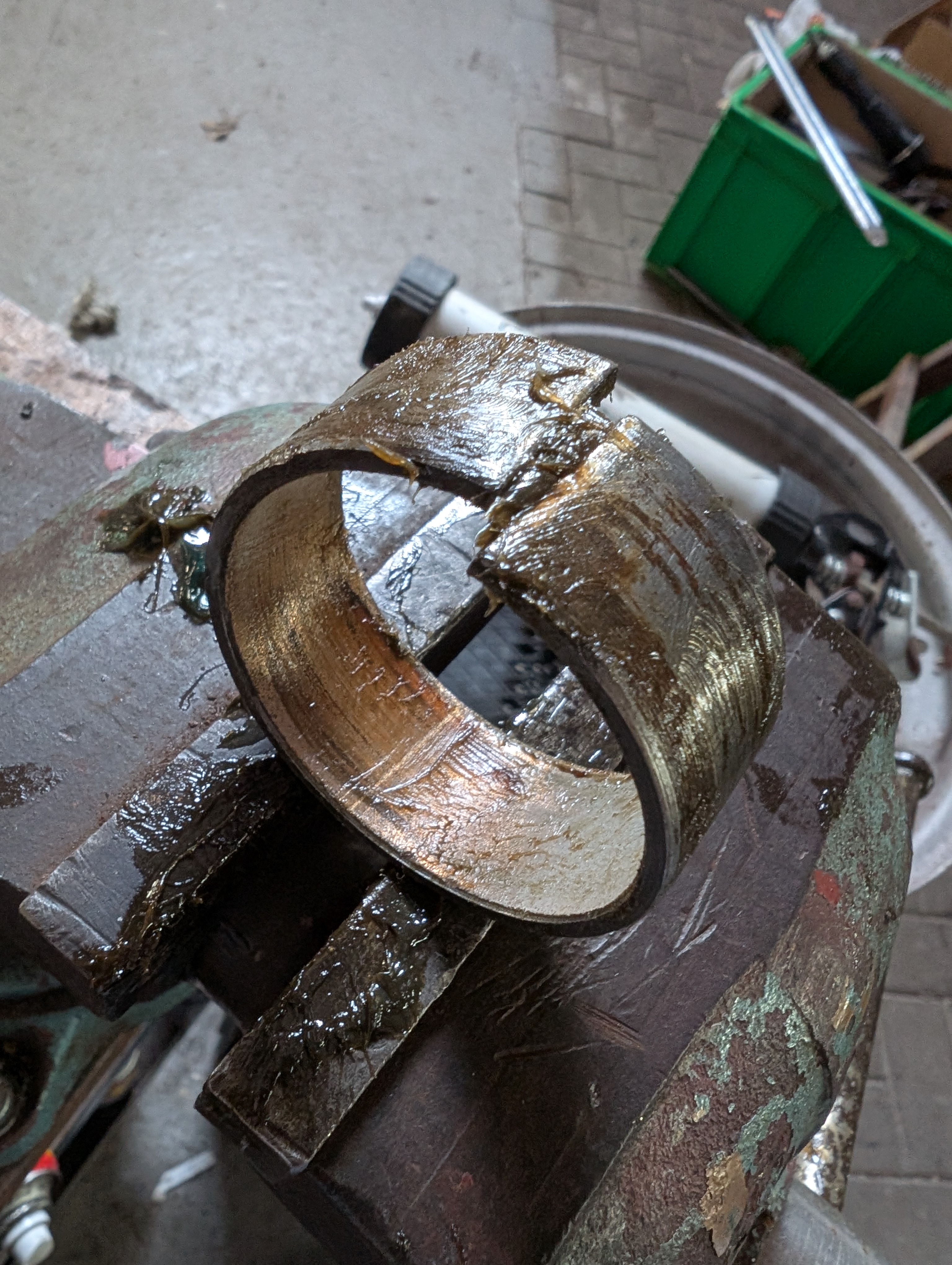 Mmmh, das sieht ja seltsam aus. Warum ist der Ring so verbogen? Welche Kräfte waren da am Werk? Einen großen Verschleiß kann ich nicht erkennen, zumal der Verschleiß ja auf der unten liegenden Seite auftreten würde, nicht an der Trennstelle.
