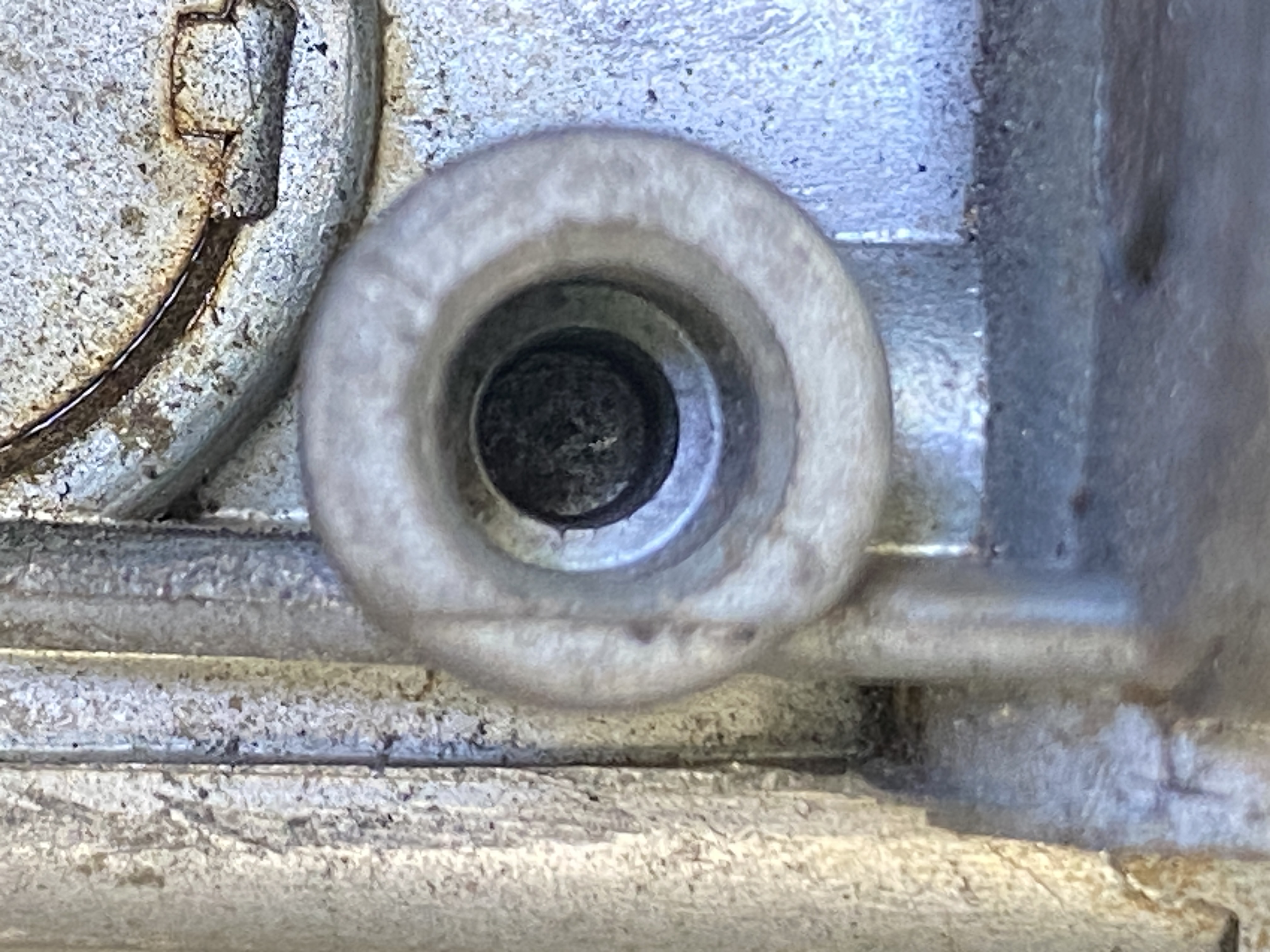 ich bin mit dem Bus in Bayern, gucke vor der morgigen Rückfahrt noch nach dem Öl und bin mir grade nicht sicher, ob beim Vergaser (34-3) in der unteren Bohrung (oberes Foto) nicht eine Plombe verloren gegangen ist. Die obere Bohrung (unteres Foto) scheint anders auszusehen.