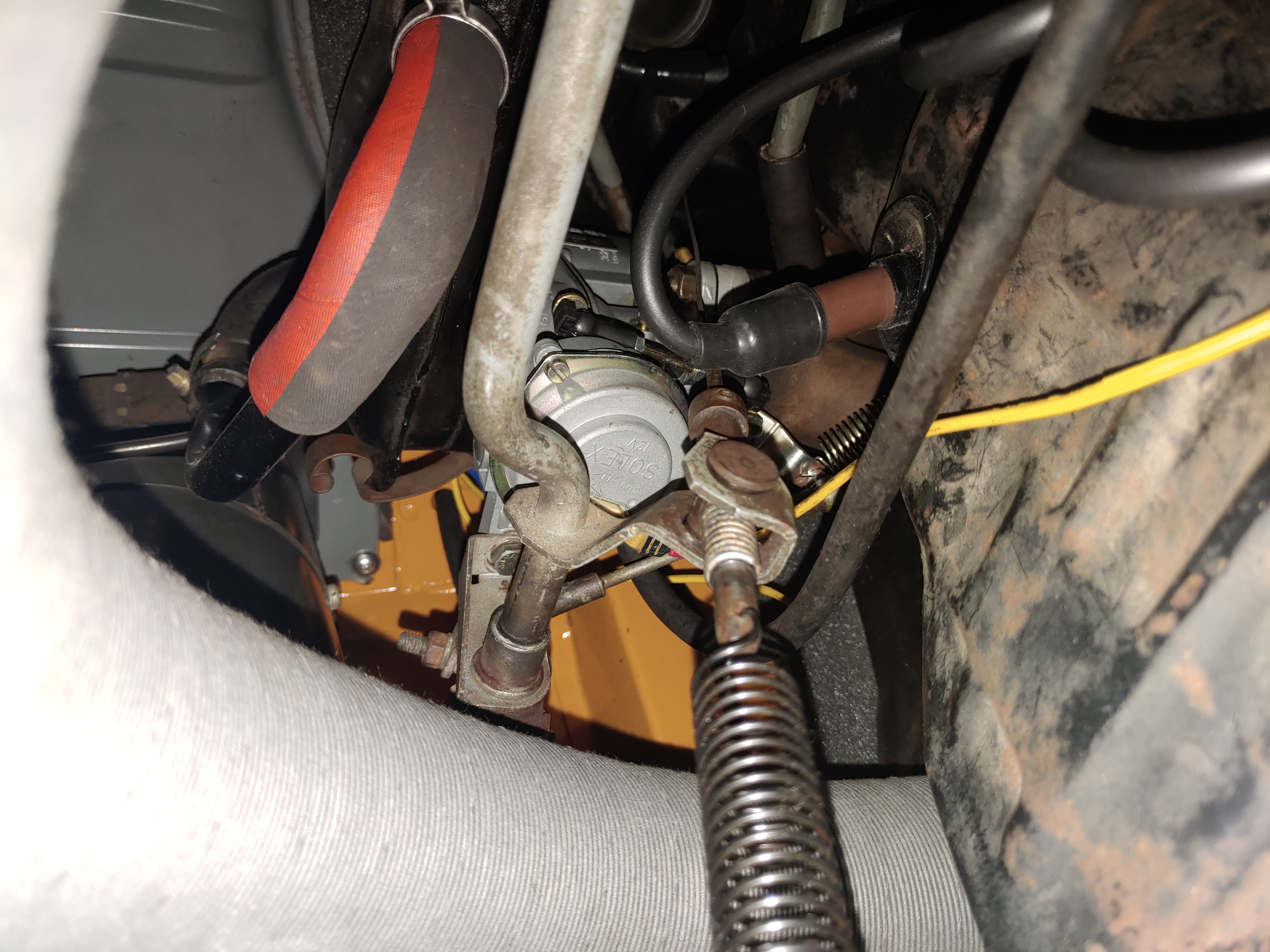 Siehe da, das Vergasergestänge macht hinten ungefähr die Hälfte des möglichen Wegs, dann steht vorne das Pedal am Boden an.