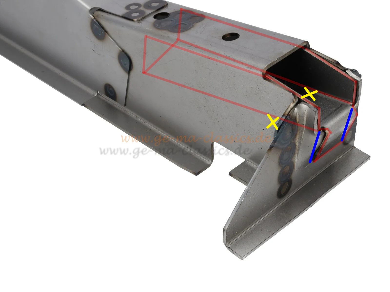 Das mit der spontanen Tieferlegung klingt gut, obwohl ich mich eher in die andere Richtung bemühe. Ob jetzt eine stabile Position gefunden wurde, kann ich nicht sagen. Auf jeden Fall führt es jetzt zu unschönen Kräfteverhältnissen in der Aufnahme. Vielleicht bringt das Bild Klarheit. Das verrutschte Teil ist rot markiert. Es ist lediglich auf der Innenseite an zwei kleinen Blechnasen mit dem Rest verschweißt (die vier Schweißpunkte im Quadrat). Die gesamte Gewichtskraft wird entlang der rechten Blechnase in die Karosserie eingeleitet. Deshalb ist die Konstruktion entlang der blauen Linie aufgerissen. Sprich: das Grundmaterial ist nicht in der Lage, die halbe Tonne Gewicht zu tragen.