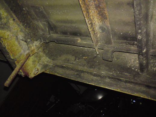 Ich hab unter meinem T2b '77 Westfalia, links unter dem Auto (gegenüber vom Abwassertank) Befestigungen für Irgendetwas gefunden. 2 Schaniere am Rahmen, die dort etwas unmotiviert herumhängen und unter der Seitenwand eine gelagerte Stange mit zwei Haken dran die einen Hebel nach unten hat mit dem man die Stange um ca. 20° verdreht und somit die Haken das 'was da auch sein sollte' auslassen. Mit einer Rückholfeder wird das ganze in Ausgangsstellung gehalten.