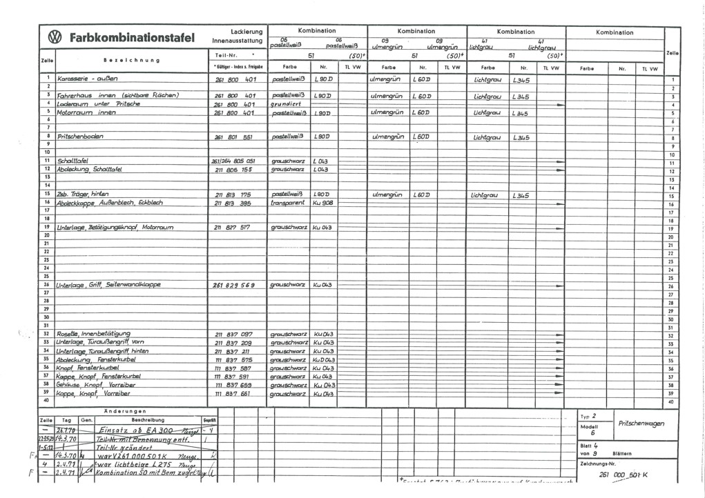 bei meiner 71er Doka ist ja nur das Oberteil des Armaturenbrettes, also die Abdeckung desselben zwischen Frontscheibe und Polsterleiste, im Originalfarbton L 043 lackiert, wie auch die Anbauteile (Lenkanlassschloss, Gehäuse Blinkerschalter, Frontplatte Ascher). Das eigentliche Armaturenbrett mit Schalttafeleinsatz ist seit dem Modelljahr 1971 mit schwarzem "Plastiküberzug" versehen.