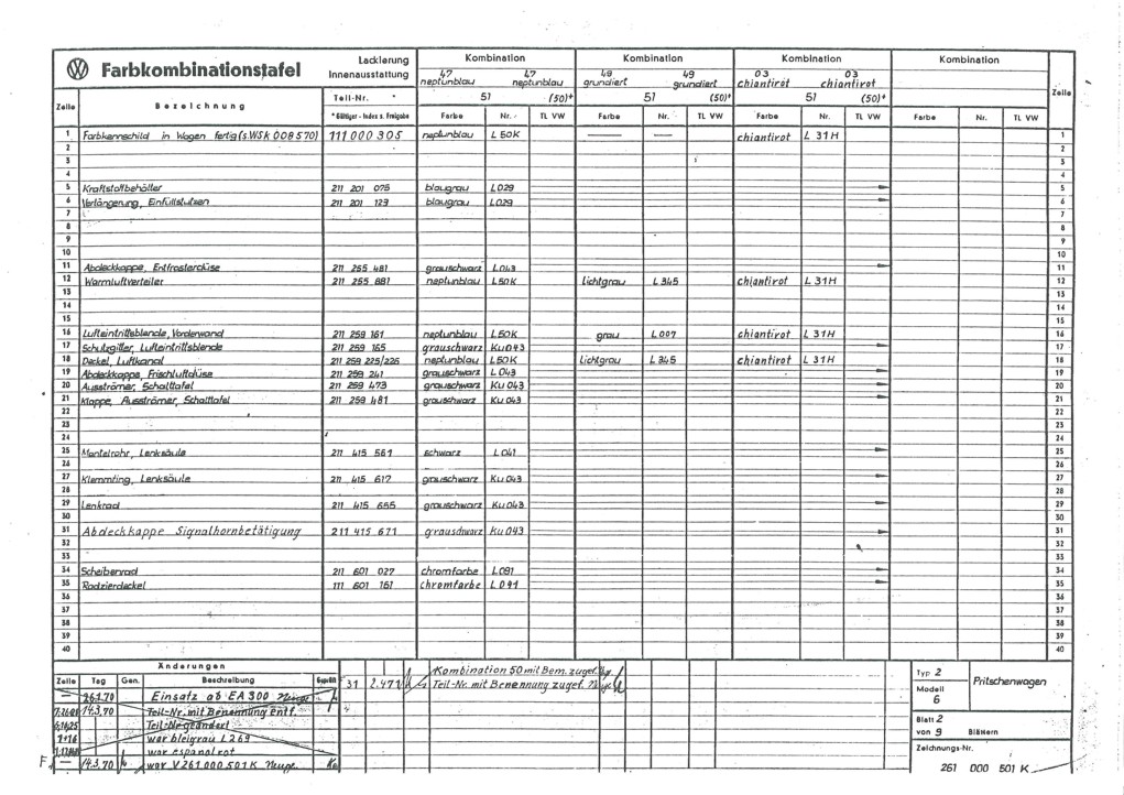 bei meiner 71er Doka ist ja nur das Oberteil des Armaturenbrettes, also die Abdeckung desselben zwischen Frontscheibe und Polsterleiste, im Originalfarbton L 043 lackiert, wie auch die Anbauteile (Lenkanlassschloss, Gehäuse Blinkerschalter, Frontplatte Ascher). Das eigentliche Armaturenbrett mit Schalttafeleinsatz ist seit dem Modelljahr 1971 mit schwarzem "Plastiküberzug" versehen.